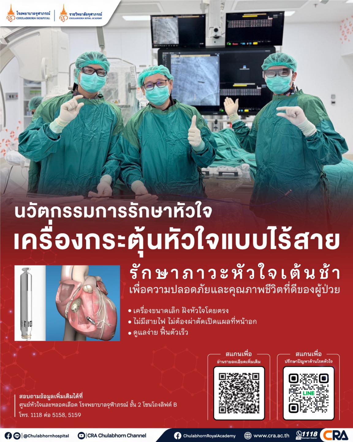 🏥 นวัตกรรมการรักษาหัวใจ: เครื่องกระตุ้นหัวใจแบบไร้สาย (Leadless Pacemaker) เทคโนโลยีใหม่ที่ช่วยให้การรักษาผู้ป่วยโรคหัวใจมีประสิทธิภาพมากขึ้น ปลอดภัย และลดภาวะแทรกซ้อนจากการผ่าตัดแบบเดิม ทางเลือกใหม่ที่เหมาะสำหรับผู้ป่วยที่มีภาวะหัวใจเต้นช้าบางประเภท โดยเฉพาะกลุ่มที่อาจมีข้อจำกัดในการใส่เครื่องแบบมีสายปกติ.📈 ความสำเร็จในปัจจุบัน ศูนย์หัวใจและหลอดเลือด โรงพยาบาลจุฬาภรณ์ ได้ประสบความสำเร็จในการดูแลรักษาผู้ป่วยกลุ่มแรกด้วยนวัตกรรมนี้แล้ว จำนวน 5 ราย.กลุ่มผู้ป่วยที่เหมาะสมกับการรักษานี้ ได้แก่: ผู้ป่วยที่มีภาวะหัวใจเต้นช้าผิดปกติ (Bradycardia)❤️ภาวะหัวใจห้องบนสั่นพลิ้วร่วมกับหัวใจเต้นช้า (Atrial Fibrillation with slow heart rate): เป็นกลุ่มหลักที่นิยมใช้เครื่องประเภทนี้❤️กลุ่มที่หัวใจเต้นช้าเป็นช่วง ๆ หรือหยุดเต้นชั่วคราว: ทำให้เกิดอาการหน้ามืด เป็นลม หรือเหนื่อยง่าย ผู้ที่มีข้อจำกัดทางกายภาพหรือความเสี่ยงสูง❤️มีความเสี่ยงต่อการติดเชื้อง่าย: เช่น ผู้ป่วยโรคไตที่ต้องฟอกไต (Hemodialysis), ผู้ป่วยโรคเบาหวาน หรือผู้ที่เคยมีประวัติการติดเชื้อจากเครื่องกระตุ้นหัวใจแบบมีสายมาก่อน❤️หลอดเลือดดำส่วนบนอุดตัน: ทำให้ไม่สามารถสอดสายไฟผ่านทางหลอดเลือดบริเวณหน้าอกได้ตามปกติ❤️ผู้สูงอายุที่มีผิวหนังบางมาก: ซึ่งเสี่ยงต่อการเกิดแผลกดทับหรือการทะลุของตัวเครื่องแบบดั้งเดิมที่ฝังใต้ผิวหนัง✅ จุดเด่นและข้อดีของการรักษา🔹ขนาดเล็กจิ๋ว: ตัวเครื่องมีขนาดเล็กมาก สามารถฝังเข้าไปในหัวใจได้โดยตรงผ่านทางหลอดเลือด🔹ไร้สายไฟ : ไม่มีสายไฟโยงจากเครื่องไปที่หัวใจ ลดความเสี่ยงของการติดเชื้อที่เกี่ยวข้องกับแผลและสายเครื่องกระตุ้นหัวใจ🔹ไม่ต้องผ่าตัดใหญ่: ไม่ต้องเปิดแผลที่หน้าอกสำหรับวางตัวเครื่องแบบเดิม ไม่มีแผลผ่าตัดภายนอก🔹ฟื้นตัวไว: ช่วยลดความไม่สบายตัวหลังทำหัตถการ ดูแลรักษาง่าย ผู้ป่วยสามารถกลับไปใช้ชีวิตปกติได้รวดเร็วขึ้น และการดูแลรักษาในระยะยาวที่ง่ายขึ้น.ทั้งนี้ การเลือกวิธีรักษาจะพิจารณาเป็นรายบุคคล โดยยึดความปลอดภัยและประโยชน์ของผู้ป่วยเป็นสำคัญโรงพยาบาลจุฬาภรณ์ มุ่งมั่นพัฒนาการดูแลผู้ป่วยกลุ่มโรคหัวใจและหลอดเลือดอย่างต่อเนื่อง […]