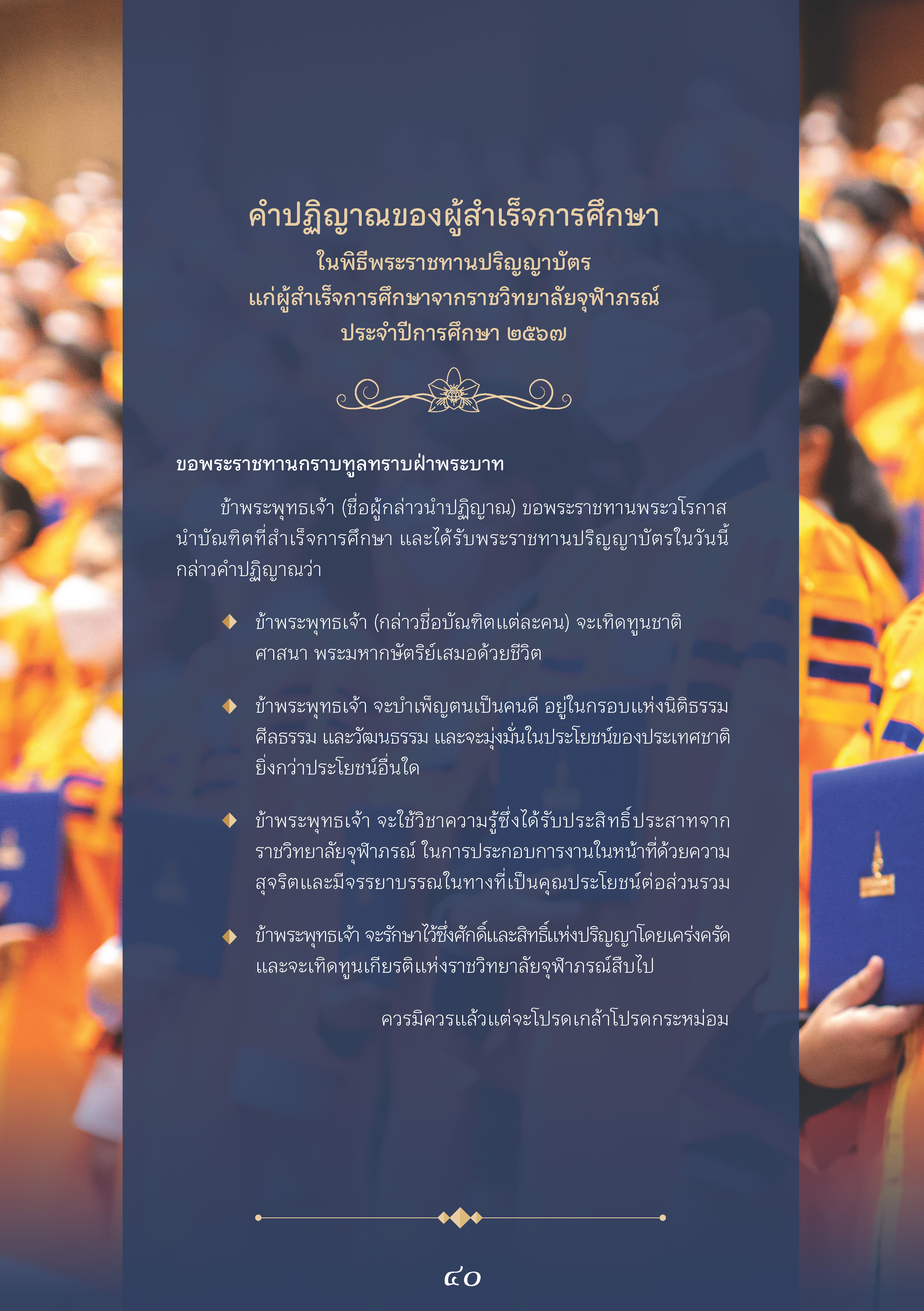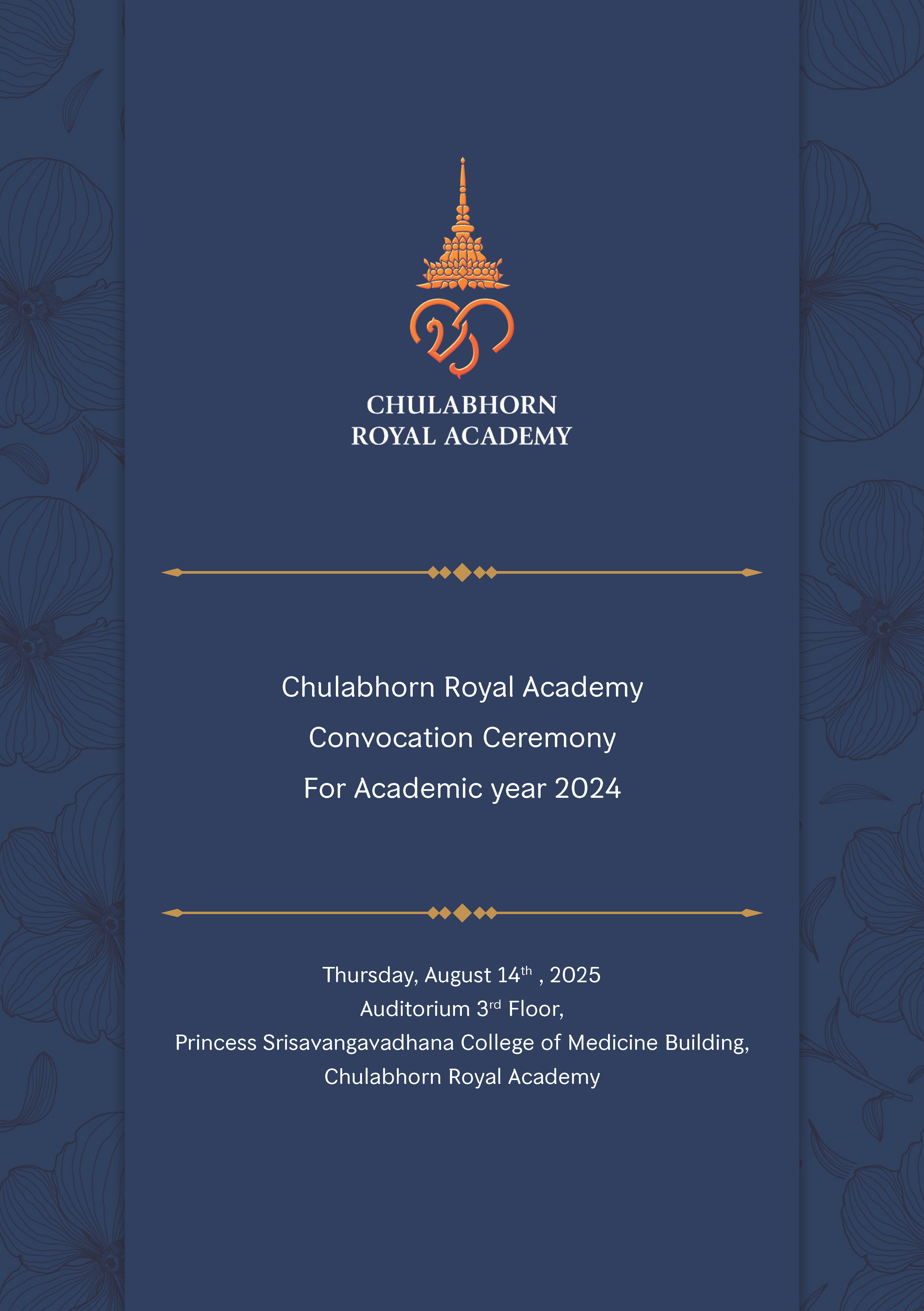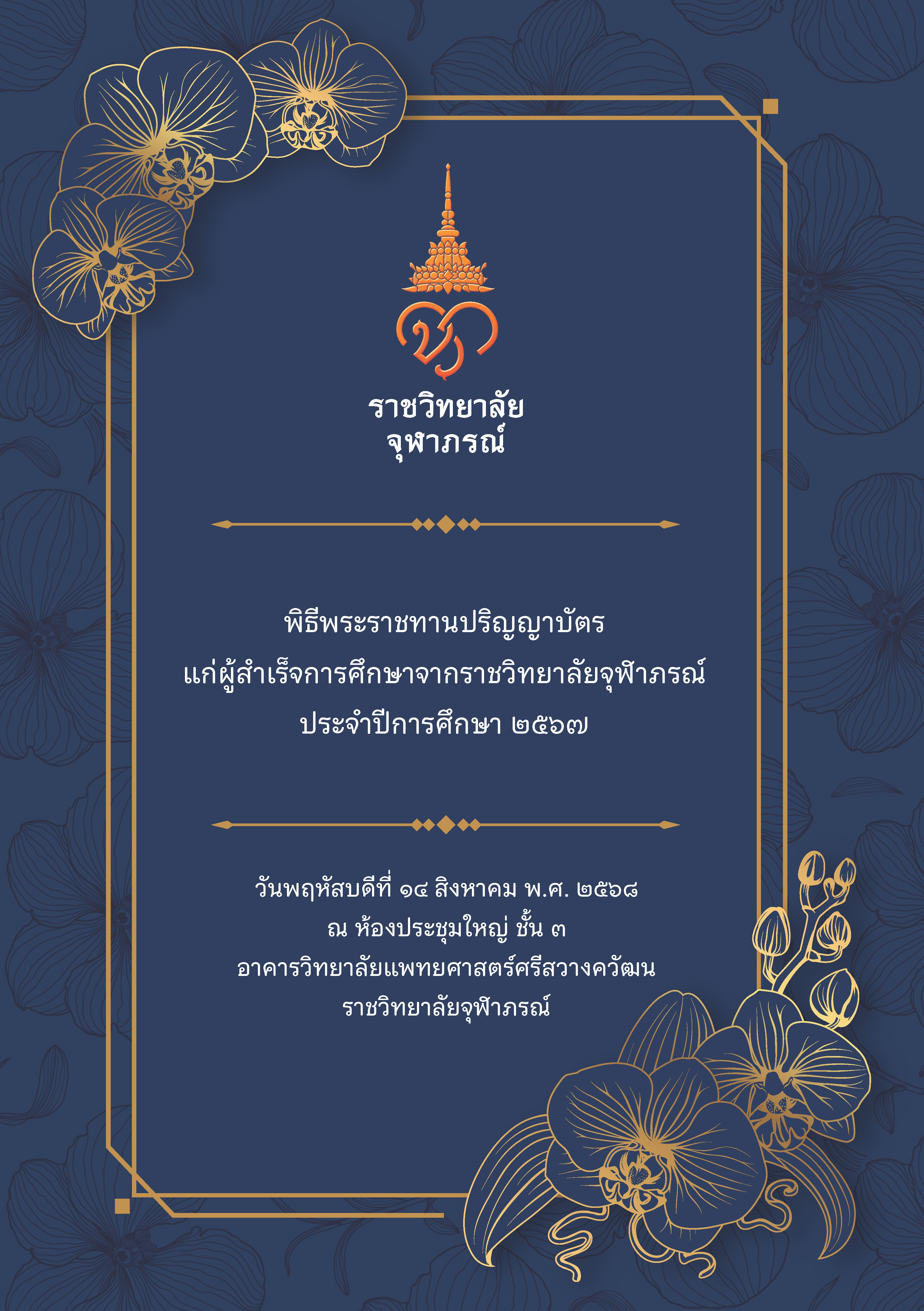 สูจิบัตร หน้าหลัก กำหนดการ ผลงานบัณฑิต รายนามบัณฑิต สูจิบัตร ข้อปฏิบัติ ปี พ.ศ. 2567 สูจิบัตรพิธีพระราชทานปริญญาบัตร ประจำปีการศึกษา 2567Download Social Media ราชวิทยาลัยจุฬาภรณ์ คณะแพทยศาสตร์ศรีสวางควัฒน วิทยาลัยวิทยาศาสตร์การแพทย์เจ้าฟ้าจุฬาภรณ์ คณะพยาบาลศาสตร์อัครราชกุมารี เว็บไซต์ที่เกี่ยวข้อง ี่ราชวิทยาลัยจุฬาภรณ์ คณะแพทยศาสตร์ศรีสวางควัฒน วิทยาลัยวิทยาศาสตร์การแพทย์เจ้าฟ้าจุฬาภรณ์ คณะพยาบาลศาสตร์อัครราชกุมารี © 2022 ราชวิทยาลัยจุฬาภรณ์. All Right Reserved