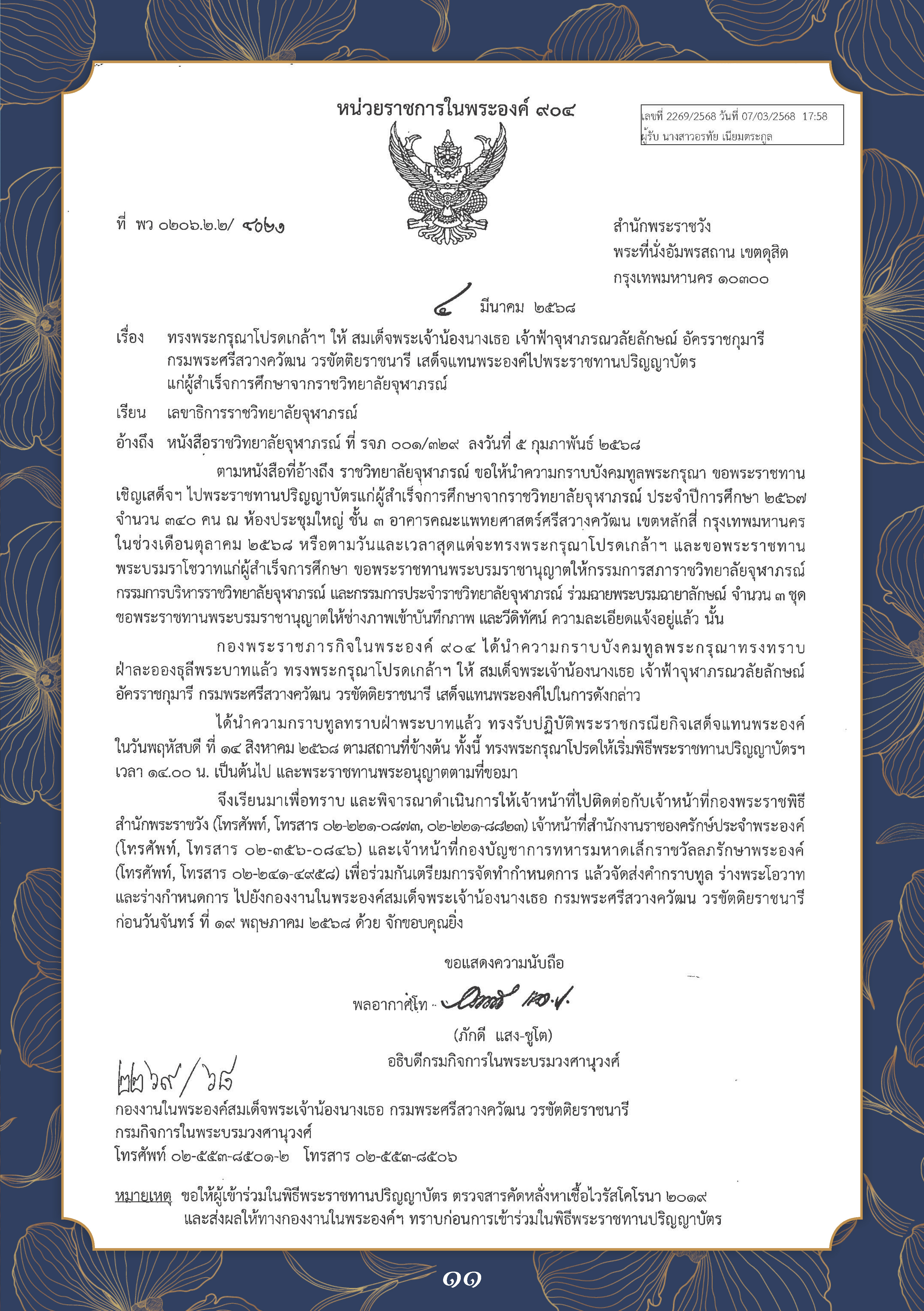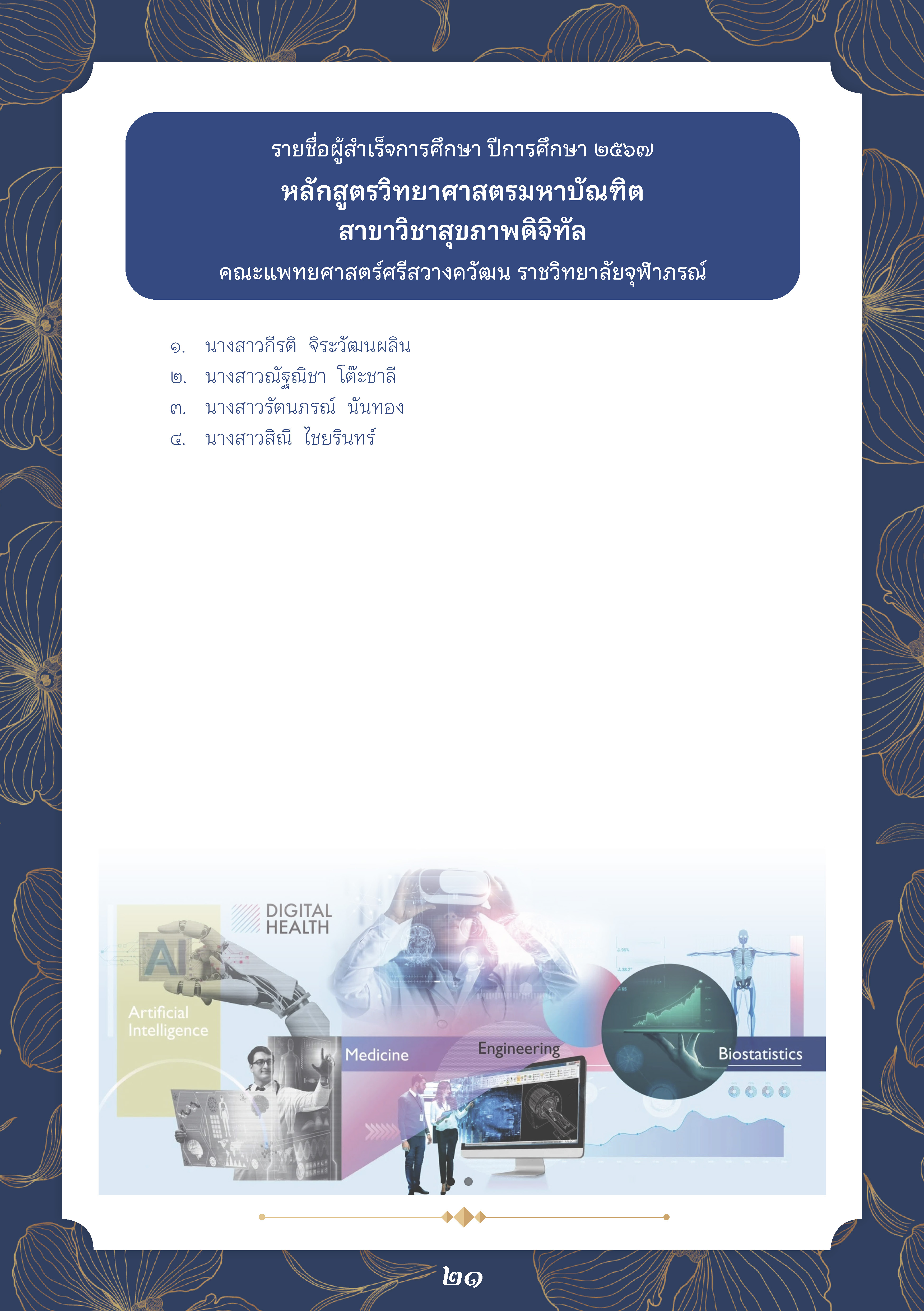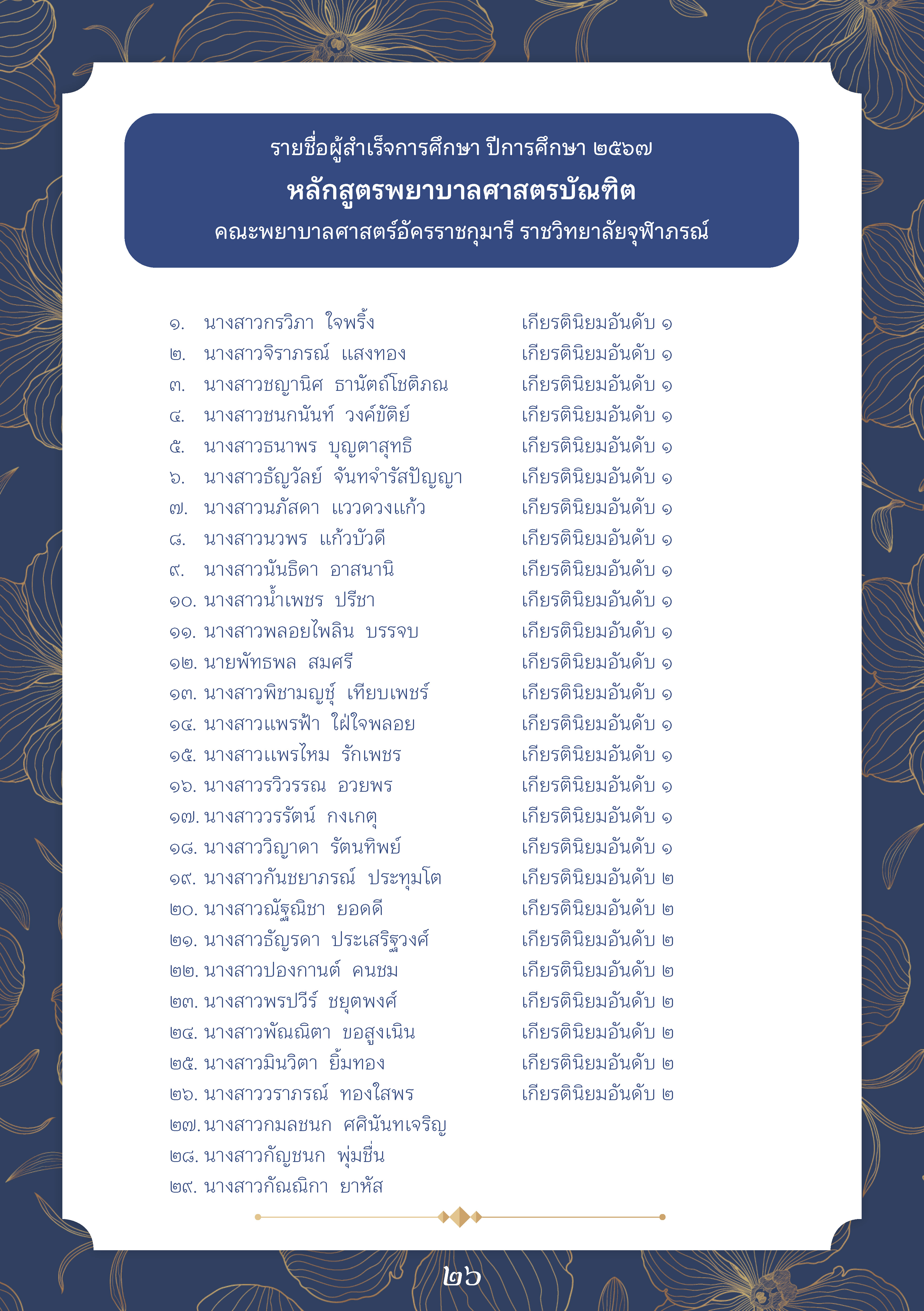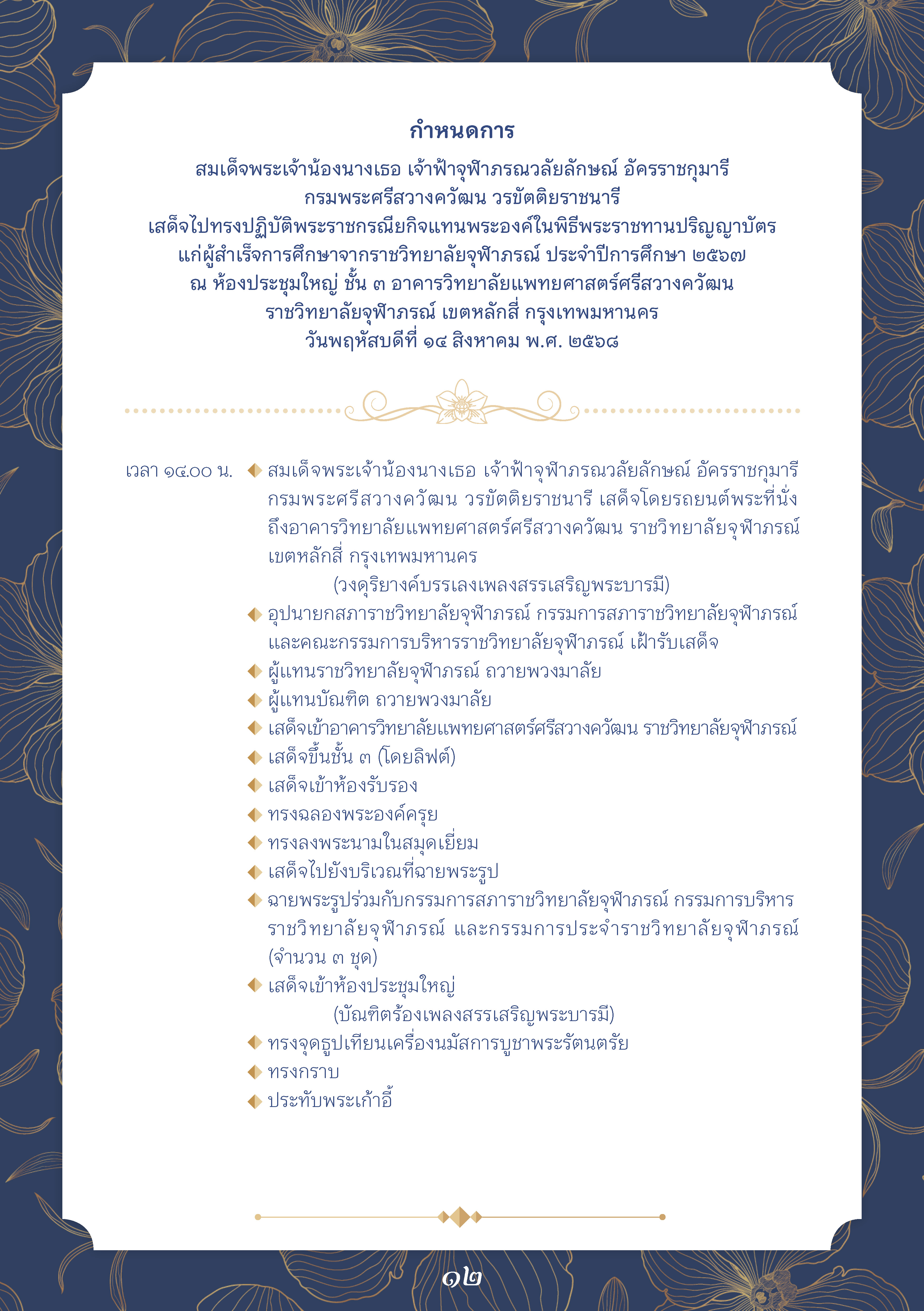 สูจิบัตร หน้าหลัก กำหนดการ ผลงานบัณฑิต รายนามบัณฑิต สูจิบัตร ข้อปฏิบัติ ปี พ.ศ. 2567 สูจิบัตรพิธีพระราชทานปริญญาบัตร ประจำปีการศึกษา 2567Download Social Media ราชวิทยาลัยจุฬาภรณ์ คณะแพทยศาสตร์ศรีสวางควัฒน วิทยาลัยวิทยาศาสตร์การแพทย์เจ้าฟ้าจุฬาภรณ์ คณะพยาบาลศาสตร์อัครราชกุมารี เว็บไซต์ที่เกี่ยวข้อง ี่ราชวิทยาลัยจุฬาภรณ์ คณะแพทยศาสตร์ศรีสวางควัฒน วิทยาลัยวิทยาศาสตร์การแพทย์เจ้าฟ้าจุฬาภรณ์ คณะพยาบาลศาสตร์อัครราชกุมารี © 2022 ราชวิทยาลัยจุฬาภรณ์. All Right Reserved