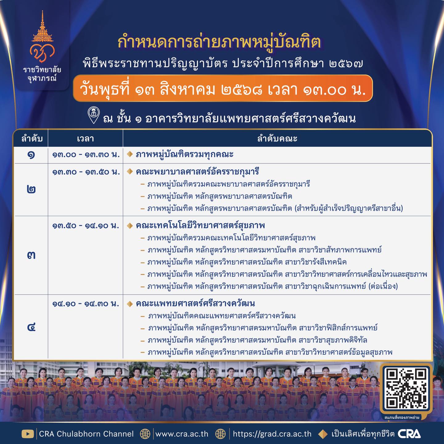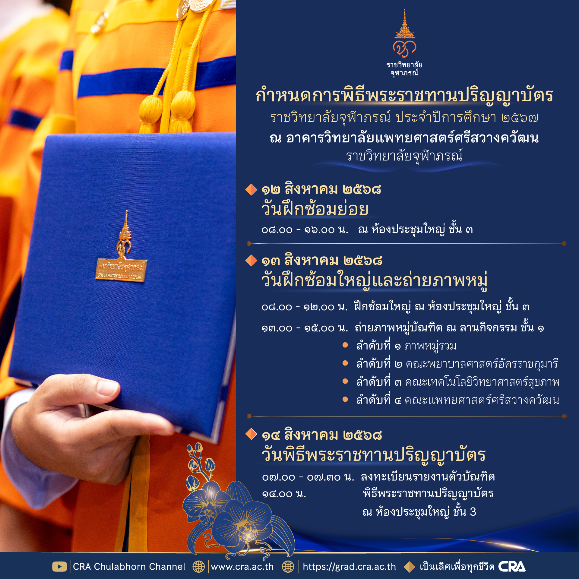 กำหนดการ หน้าหลัก กำหนดการ ผลงานบัณฑิต รายนามบัณฑิต สูจิบัตร ข้อปฏิบัติ กำหนดการฝึกช้อมและการลงทะเบียนบัณฑิต 2567Download Social Media ราชวิทยาลัยจุฬาภรณ์ คณะแพทยศาสตร์ศรีสวางควัฒน วิทยาลัยวิทยาศาสตร์การแพทย์เจ้าฟ้าจุฬาภรณ์ คณะพยาบาลศาสตร์อัครราชกุมารี เว็บไซต์ที่เกี่ยวข้อง ราชวิทยาลัยจุฬาภรณ์ คณะแพทยศาสตร์ศรีสวางควัฒน วิทยาลัยวิทยาศาสตร์การแพทย์เจ้าฟ้าจุฬาภรณ์ คณะพยาบาลศาสตร์อัครราชกุมารี © 2022 ราชวิทยาลัยจุฬาภรณ์. All Right Reserved