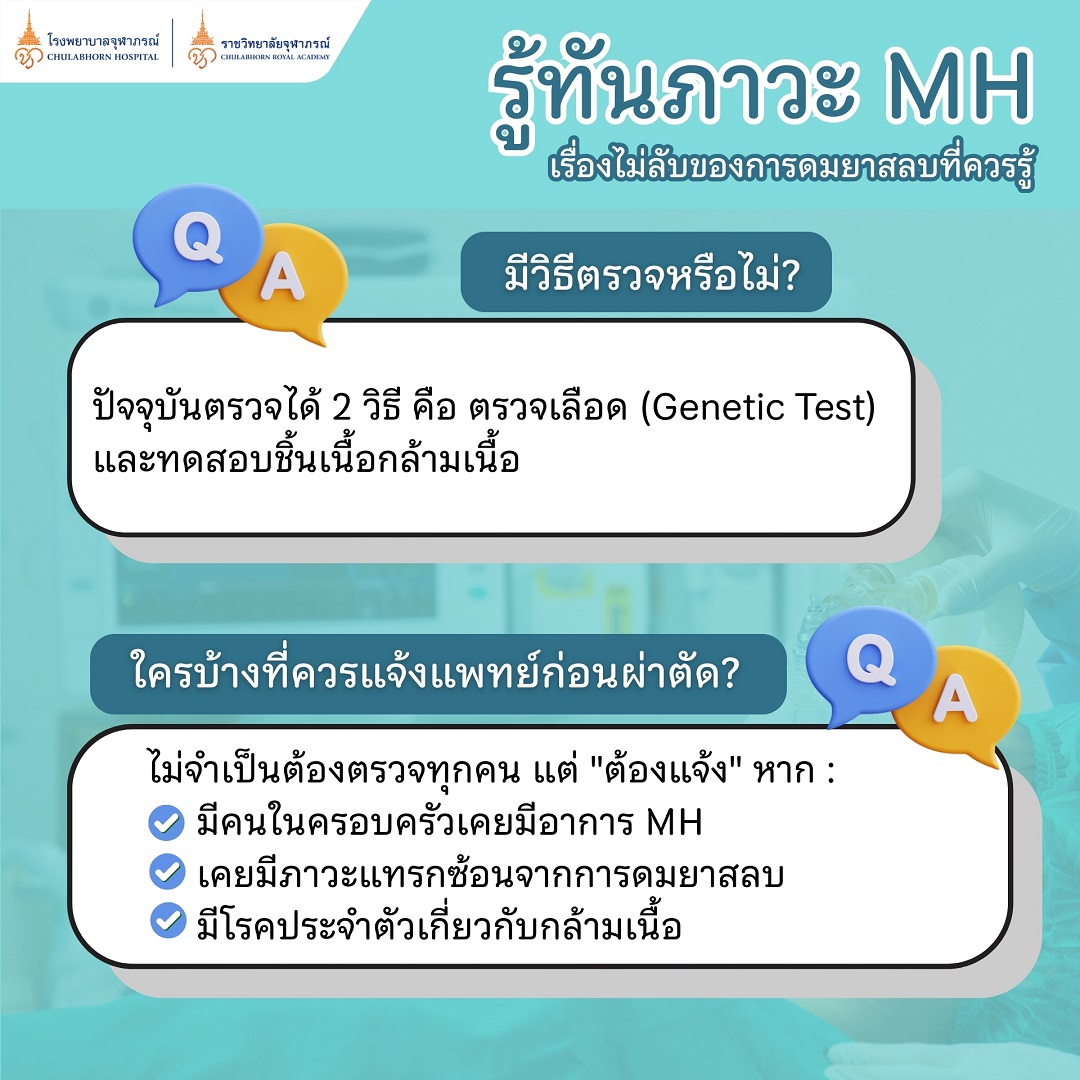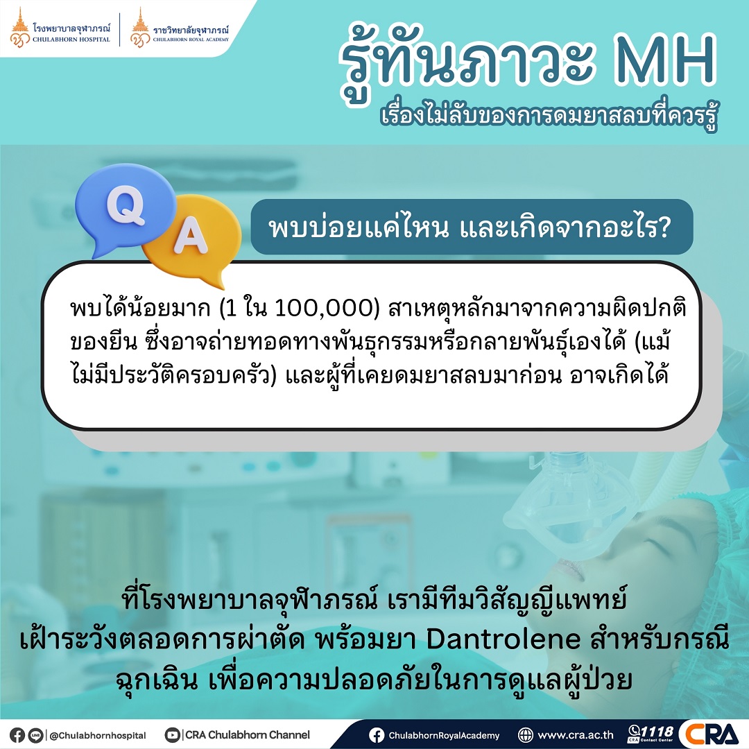 สาเหตุ : เกิดจากความผิดปกติของยีนที่เกี่ยวข้องกับการทำงานของกล้ามเนื้อ อาจถ่ายทอดทางพันธุกรรมในครอบครัว หรือเกิดจากการกลายพันธุ์ของยีนได้เอง ดังนั้น แม้ไม่มีประวัติครอบครัว หรือเคยดมยาสลบมาก่อน ก็ยังสามารถเกิด MH ได้
