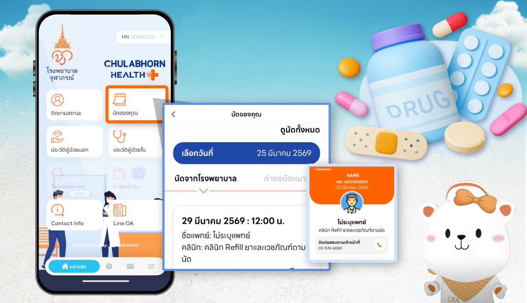 ผู้รับบริการสามารถตรวจสอบรายละเอียดวันนัดรับยาและเวชภัณฑ์ ได้ด้วยตนเองผ่านแอปพลิเคชัน Chulabhorn Health+ ในเมนู “นัดของคุณ” ชื่อคลินิก Refill ยาและเวชภัณฑ์ตามนัด