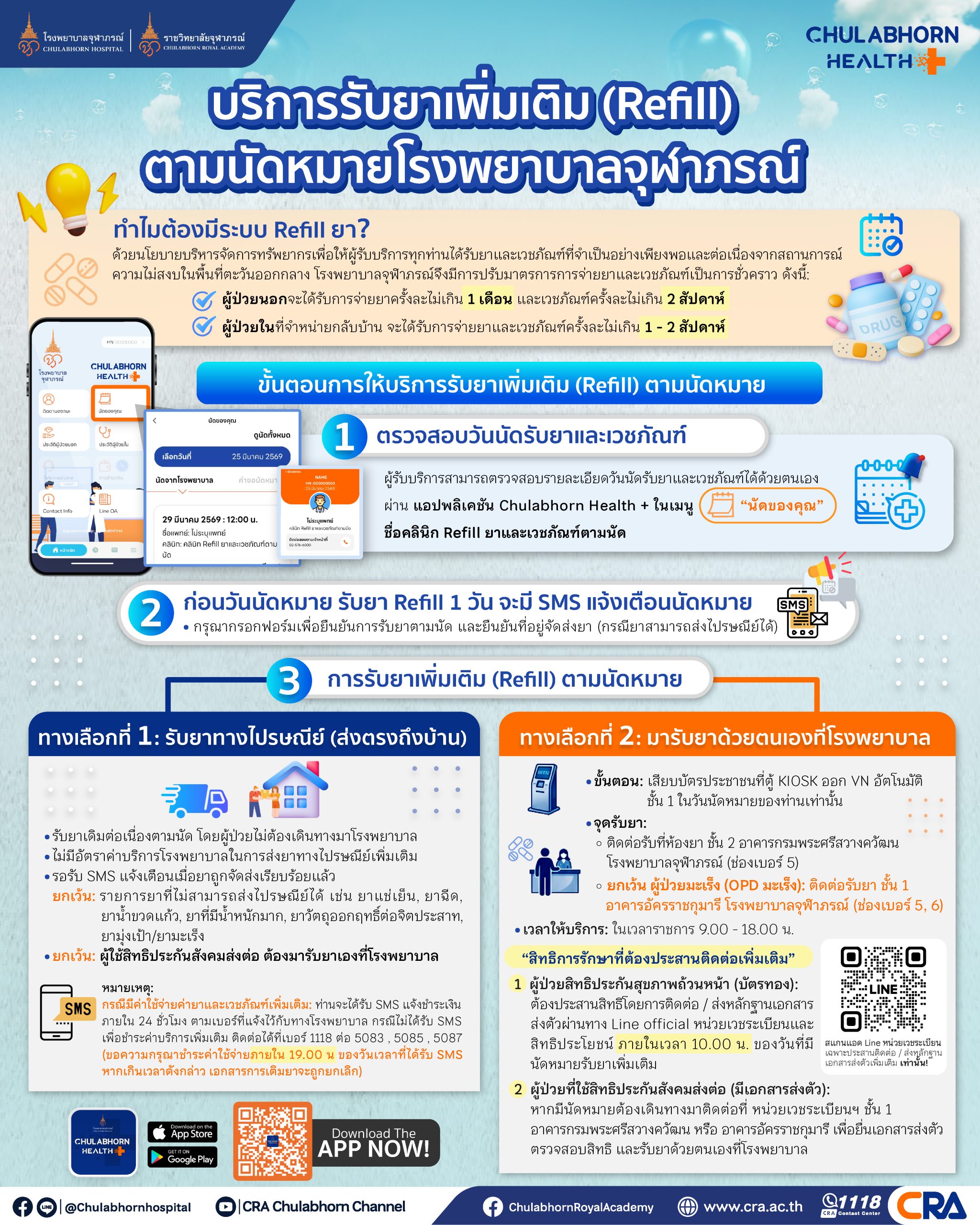 —– ยกเว้น ผู้ป่วยมะเร็ง (OPD มะเร็ง): ติดต่อรับยา ชั้น 1 อาคารอัครราชกุมารี โรงพยาบาลจุฬาภรณ์ (ช่องเบอร์ 5, 6)