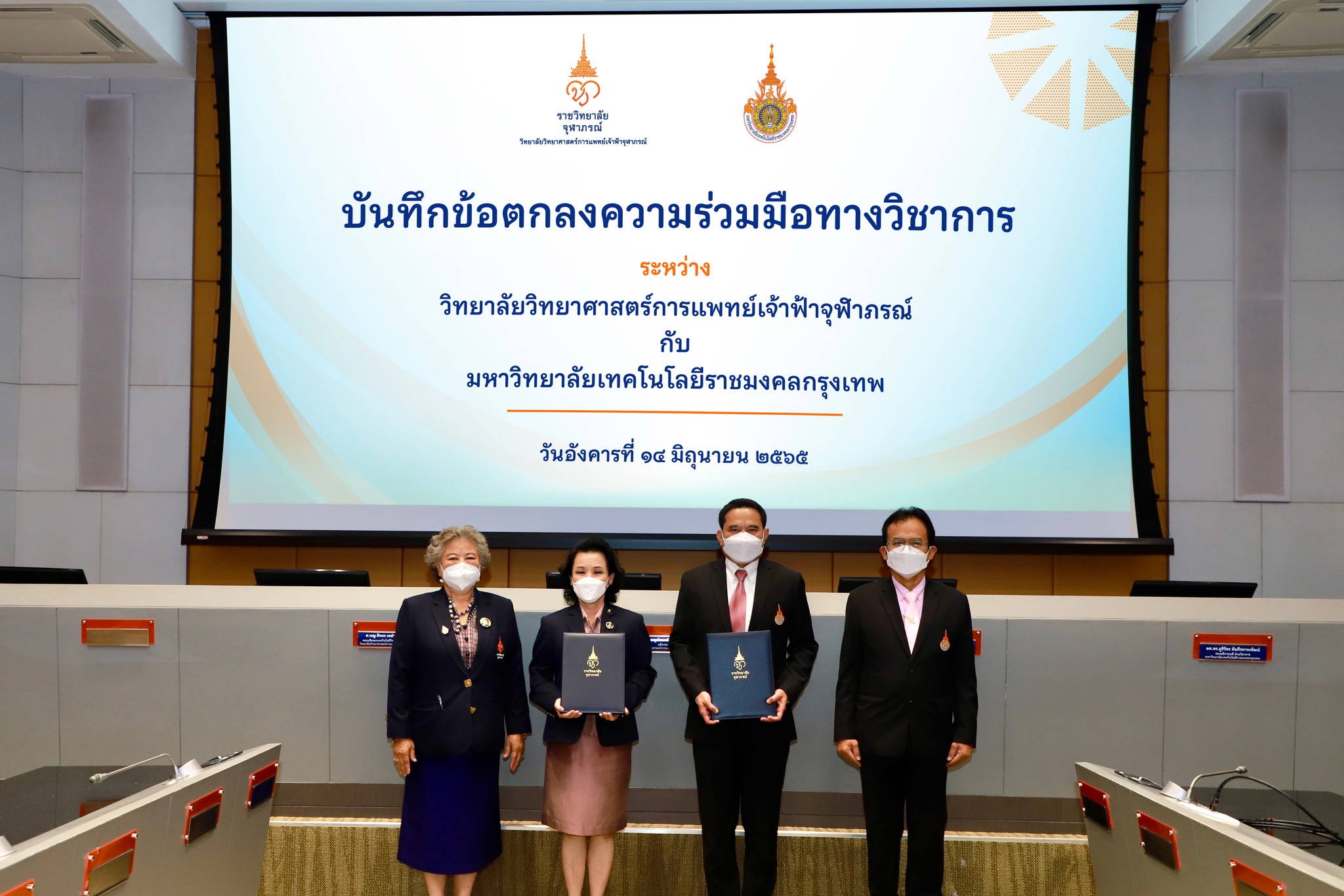 14 มิถุนายน 2565 : ศาสตราจารย์คลินิก แพทย์หญิงโฉมศรี โฆษิตชัยวัฒน์ อธิการบดีวิทยาลัยวิทยาศาสตร์การแพทย์เจ้าฟ้าจุฬาภรณ์ พร้อมด้วย ศาสตราจารย์ แพทย์หญิงจิรพร เหล่าธรรมทัศน์ คณบดีคณะเทคโนโลยีวิทยาศาสตร์สุขภาพ ลงนามบันทึกข้อตกลงความร่วมมือทางวิชาการ ร่วมกับมหาวิทยาลัยเทคโนโลยีราชมงคลกรุงเทพ โดยมี รองศาสตราจารย์ ดร.พิชัย จันทร์มณี รักษาราชการแทนอธิการบดี มหาวิทยาลัยเทคโนโลยีราชมงคลกรุงเทพ และผู้ช่วยศาสตราจารย์ ดร. ภูริวัตร คัมภีรภาพพัฒน์ รองอธิการบดีฝ่ายวิชาการ ร่วมลงนามเป็นสักขีพยาน โดยมีวัตถุประสงค์เพื่อสนับสนุนและส่งเสริมการพัฒนางานด้านการศึกษา การวิจัย งานบริการวิชาการ และงานทำนุบำรุงส่งเสริมศิลปะวัฒนธรรมเชิงสร้างสรรค์และเชิงอนุรักษ์ ณ ห้องประชุมใหญ่ MC232 ชั้น 3 อาคารสำนักงานราชวิทยาลัยจุฬาภรณ์ กรุงเทพมหานครสำหรับการลงนามบันทึกความร่วมมือระหว่างวิทยาลัยวิทยาศาสตร์การแพทย์เจ้าฟ้าจุฬาภรณ์ ราชวิทยาลัยจุฬาภรณ์ และมหาวิทยาลัยเทคโนโลยีราชมงคลกรุงเทพในครั้งนี้ ทั้งสองหน่วยงานมีวัตถุประสงค์ในการสร้างความร่วมมือกัน เพื่อดำเนินงานทางด้านวิชาการ สนับสนุนส่งเสริมพัฒนางานการจัดการศึกษาด้วยการผสานความร่วมมือในการจัดการศึกษาร่วมกันในหลักสูตรปริญญาบัตร ประกาศนียบัตร สัมฤทธิบัตร และโครงการจัดการศึกษาเพื่อสถานประกอบการและประชาชนทั่วไป รวมถึงส่งเสริมการจัดโครงการศึกษาและการฝึกอบรมร่วมกันเพื่อเสริมสร้างทักษะและสมรรถนะให้แก่บุคลากรของทั้งสองฝ่าย สนับสนุนและส่งเสริมพัฒนางานที่เกี่ยวข้องกับงานวิจัยโดยทำวิจัยร่วมกันระหว่างบุคลากรและนักศึกษา ทั้งในด้านวิทยาศาสตร์และเทคโนโลยี และด้านมนุษยศาสตร์และสังคมศาสตร์ สนับสนุนและส่งเสริมการพัฒนางานบริการวิชาการด้วยการส่งเสริมการจัดโครงการประชุมเผยแพร่ผลงานทางวิชาการร่วมกัน ทั้งในด้านวิทยาศาสตร์และเทคโนโลยี ด้านมนุษยศาสตร์และสังคมศาสตร์ ตลอดจนมีการจัดกิจกรรมและการจัดโครงการบริการวิชาการร่วมกัน รวมถึงสนับสนุนและส่งเสริมการพัฒนางานทำนุบำรุงส่งเสริมศิลปะวัฒนธรรมทั้งในเชิงสร้างสรรค์และเชิงอนุรักษ์ร่วมกันด้วย