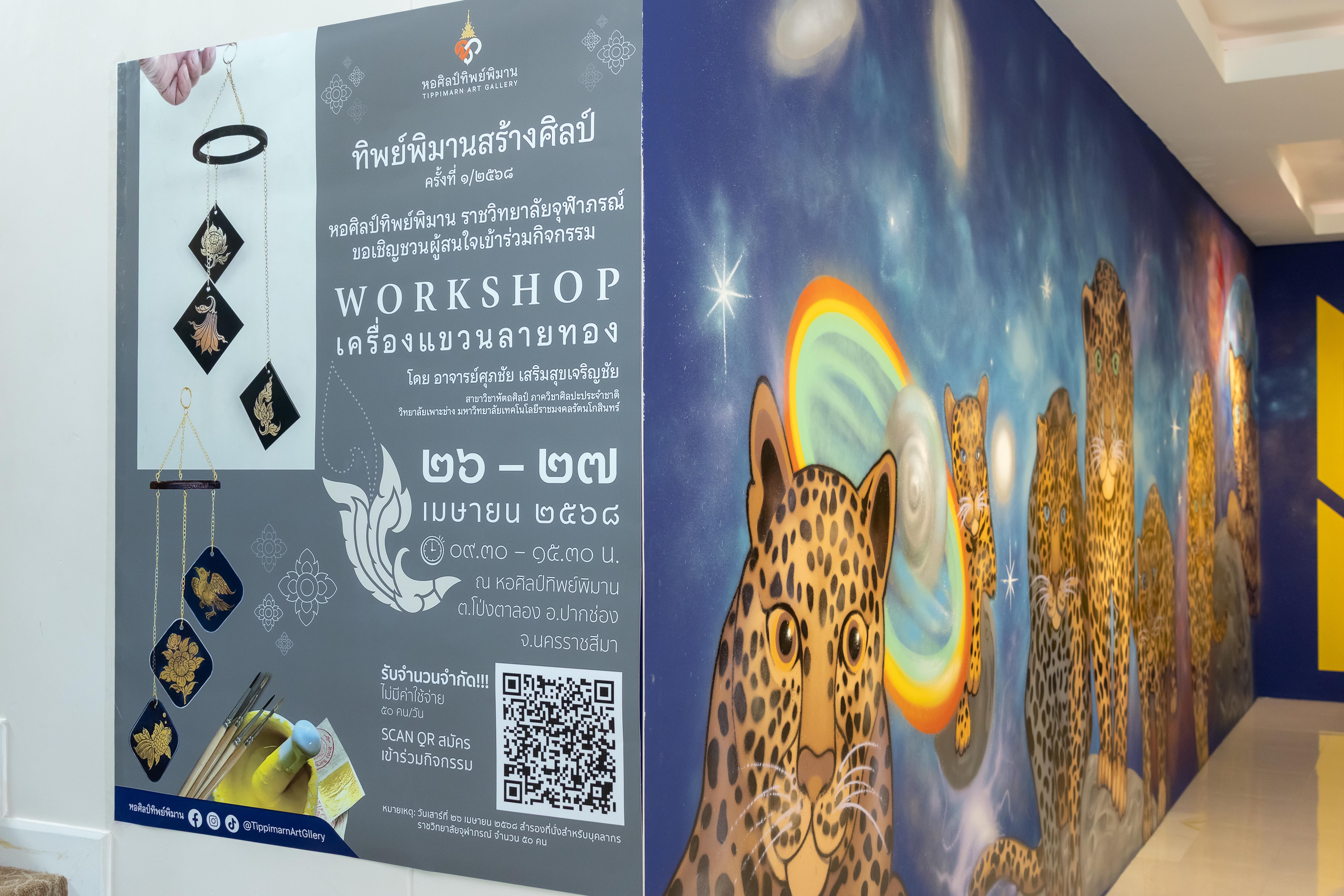 โครงการ ทิพย์พิมานสร้างศิลป์ ครั้งที่ ๑/๒๕๖๘ (workshop: เครื่องแขวนลายทอง) จัดขึ้นระหว่างวันที่ ๒๖ และ ๒๗ เมษายน ๒๕๖๘ เปิดโอกาสให้เด็กและเยาวชน บุคลากรราชวิทยาลัยจุฬาภรณ์ รวมถึงผู้สนใจทั่วไปสมัครเข้าร่วมกิจกรรม ณ หอศิลป์ทิพย์พิมาน ต.โป่งตาลอง อ.ปากช่อง จ.นครราชสีมา โดยมีอาจารย์ปัญญา วิจินธนสาร ผู้อำนวยการหอศิลป์ทิพย์พิมาน เป็นประธานเปิดงาน พร้อมด้วยรองศาสตราจารย์วิรัญญา จิราธิกิตติ์ รองผู้อำนวยการหอศิลป์ทิพย์พิมาน และอาจารย์ศุภชัย เสริมสุขเจริญชัย อาจารย์ประจำสาขาวิชาหัตถศิลป์ ภาควิชาศิลปะประจำชาติ วิทยาลัยเพาะช่าง มหาวิทยาลัยเทคโนโลยีราชมงคลรัตนโกสินทร์ ให้เกียรติเป็นวิทยากรบรรยายในหัวข้อ การเขียนลายไทย และการประยุกต์ใช้ลายไทยกับชีวิต พร้อมสาธิตการเขียนลายไทยและการทำเครื่องแขวนลายทอง พร้อมกันนี้ได้สอนการประดิษฐ์ “ เครื่องแขวนลายทอง” ให้แก่ผู้เข้าร่วมกิจกรรมในครั้งนี้ด้วย ทั้งนี้ โครงการดังกล่าวเป็นการศึกษาเรียนรู้ศิลปะไทยด้วยการลงมือปฏิบัติสร้างสรรค์ผลงานลวดลายไทยด้วยตนเอง กับวิทยากรที่มีความรู้ความสามารถ เพื่อให้ผู้เข้าร่วมได้มีความรู้ตั้งแต่ขั้นพื้นฐาน และกระตุ้นความคิดสร้างสรรค์ ตลอดจนสามารถนำไปใช้ในการพัฒนาต่อยอดเป็นอาชีพ อีกทั้งเป็นการใช้เวลาว่างให้เกิดประโยชน์ และยังเป็นการปลูกฝังจิตสำนึกให้เด็กและเยาวชนคนรุ่นใหม่ได้สนใจศิลปะไทย ได้รู้และเข้าใจคุณค่าของลายไทย เพื่อเป็นการสืบสานอนุรักษ์ศิลปะไทยให้คงอยู่สืบไป