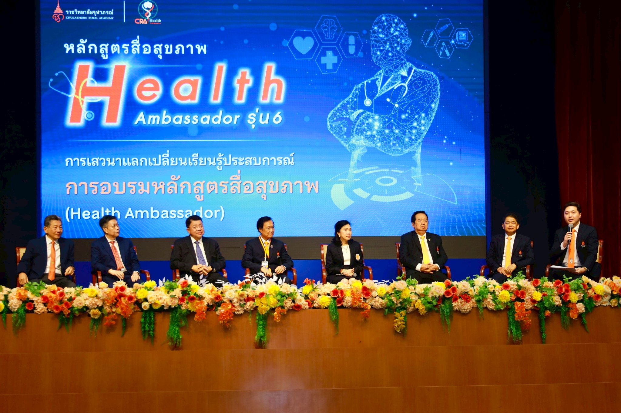 วันที่ ๔ กันยายน ๒๕๖๘ ราชวิทยาลัยจุฬาภรณ์ เปิดอบรมหลักสูตร “สื่อสุขภาพ (Health Ambassador)” รุ่นที่ ๖ เสริมสร้างผู้นำสุขภาพยุคใหม่ เพื่อขับเคลื่อนสุขภาวะอย่างยั่งยืน โดยมีศาสตราจารย์เกียรติคุณ นายแพทย์รัชตะ รัชตะนาวิน รักษาการรองเลขาธิการราชวิทยาลัยจุฬาภรณ์ เป็นประธานเปิดการอบรมหลักสูตรฯ และรองศาสตราจารย์ นายแพทย์สุรศักดิ์ ลีลาอุดมลิปิ รักษาการผู้อำนวยการโรงพยาบาลจุฬาภรณ์ กล่าวนำเสนอหลักสูตรฯ ต่อด้วยการเสวนาแลกเปลี่ยนเรียนรู้ประสบการณ์การอบรมหลักสูตรสุขภาพ โดยคุณประเสริฐ บุญสัมพันธ์ ประธานคณะกรรมการบริหารและคัดเลือกผู้สมัครเข้ารับการอบรม , ดร.สมชาย อัศวเศรณี ประธานหลักสูตรสื่อสุขภาพ รุ่นที่ ๑ , คุณสุพัตรา จิราธิวัฒน์ คณะกรรมการบริหารและคัดเลือกผู้สมัครเข้ารับการอบรมหลักสูตรสื่อสุขภาพและผู้เข้ารับการอบรมรุ่นที่ ๑ , คุณไพวงษ์ เตชะณรงค์ ประธานหลักสูตรสื่อสุขภาพ รุ่นที่ ๒ , คุณวิสิฐ ตันติสุนทร ประธานหลักสูตรสื่อสุขภาพ รุ่นที่ ๓ , คุณคณกร เตชาหัวสิงห์ ประธานหลักสูตรสื่อสุขภาพ รุ่นที่ ๔ และพลเอก ดร.วิชิต ยาทิพย์ ผู้แทนประธานหลักสูตรสื่อสุขภาพ รุ่นที่ ๕ และผู้เข้ารับการอบรมรุ่นที่ ๕ จากนั้น หม่อมหลวงปนัดดา ดิศกุล เลขาธิการมูลนิธิศรีสวางควัฒน ในพระอุปถัมภ์ สมเด็จเจ้าฟ้าฯ กรมพระศรีสวางควัฒน วรขัตติยราชนารี ขึ้นกล่าวบรรยายพิเศษ ในหัวข้อ “ความเพียร ซื่อตรง เป็นสุภาพชน” ณ ห้องประชุม Convention Hall สถาบันวิจัยจุฬาภรณ์ เขตหลักสี่ กรุงเทพมหานคร