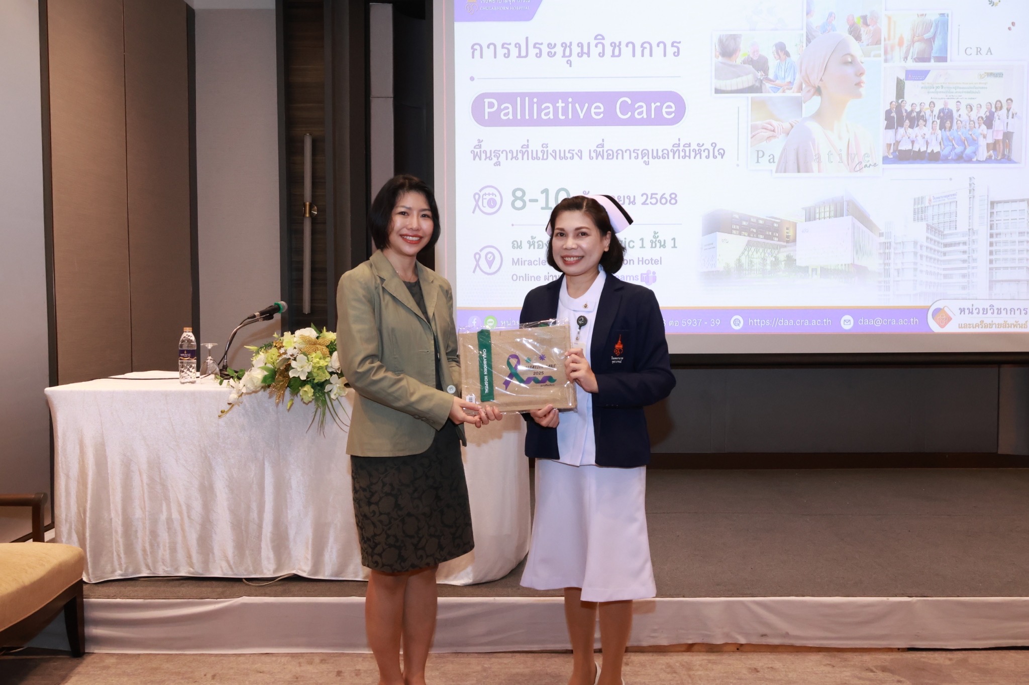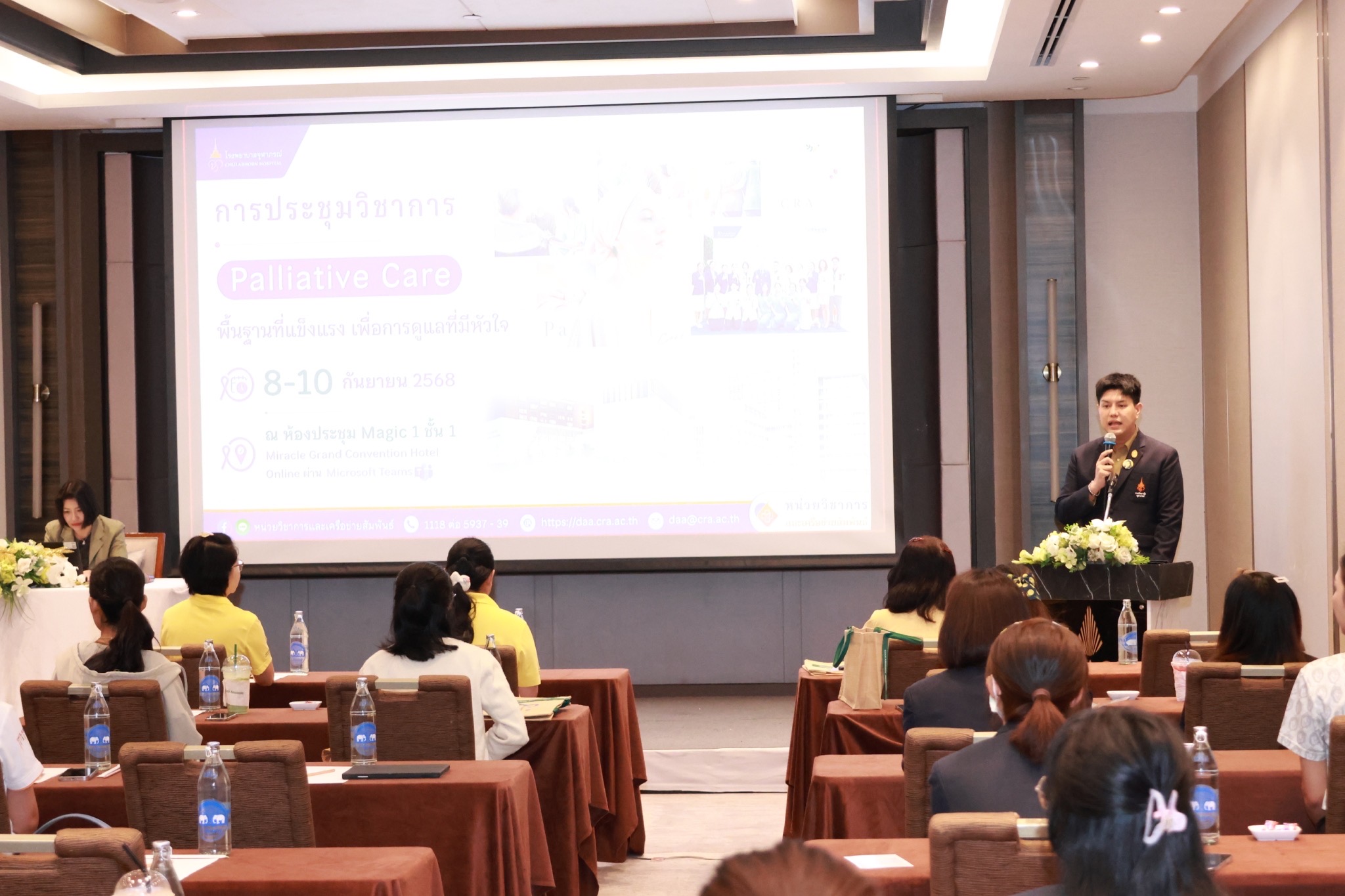 วันที่ 8 กันยายน 2568 หน่วยชีวิตาภิบาล และคณะกรรมการการดูแลผู้ป่วยแบบประคับประคอง ร่วมกับ สำนักวิชาการ โรงพยาบาลจุฬาภรณ์ ราชวิทยาลัยจุฬาภรณ์ จัดการประชุมวิชาการและการอบรมเชิงปฏิบัติการการดูแลผู้ป่วยแบบประคับประคอง ประจำปี 2568 ขึ้น ด้วยมะเร็งเป็นโรคเรื้อรังที่เป็นปัญหาสำคัญทางสาธารณสุขของทุกประเทศทั่วโลก การดูแลแบบประคองหรือ Palliative Care เป็นการเพิ่มคุณภาพชีวิตและลดความทุกข์ทรมานให้กับผู้ป่วย โดยสามารถให้การดูแลควบคู่ไปกับการรักษาหลักของการรักษามะเร็งได้ จึงได้จัดอบรมทั้งภาคทฤษฎีและภาคปฏิบัติขึ้น ในหัวข้อที่สำคัญเกี่ยวกับการดูแลผู้ป่วยแบบประคับประคอง ในรูปแบบการประชุมแบบ Hybrid ประกอบด้วย การประชุมทางไกลผ่านระบบออนไลน์โปรแกรม Microsoft Team และการประชุมแบบออนไซต์ รวมระยะเวลา 3 วัน ระหว่างวันที่ 8 – 10 กันยายน 2568 โดยมี นพ.อดิศร บุญญาภิบาล ผู้ช่วยผู้อำนวยการโรงพยาบาลจุฬาภรณ์ เป็นประธานกล่าวเปิดการประชุม พร้อมด้วย นพ.สวิส มัธยมนันทน์ ประธานคณะกรรมการการดูแลผู้ป่วยแบบประคับประคอง โรงพยาบาลจุฬาภรณ์ และแพทย์เฉพาะทางสาขาเวชศาสตร์ครอบครัวและเวชศาสตร์วิถีชีวิต , พญ.จอมธนา ศิริไพบูลย์ ผู้อำนวยการศูนย์มะเร็งวิทยา โรงพยาบสลจุฬาภรณ์ , นางสาวรัตนา จุลสวัสดิ์ หัวหน้าฝ่ายการพยาบาล ร่วมในการเปิดการประชุม ณ ห้องประชุม Magic 1 Miracle Grand Convention Hotel
