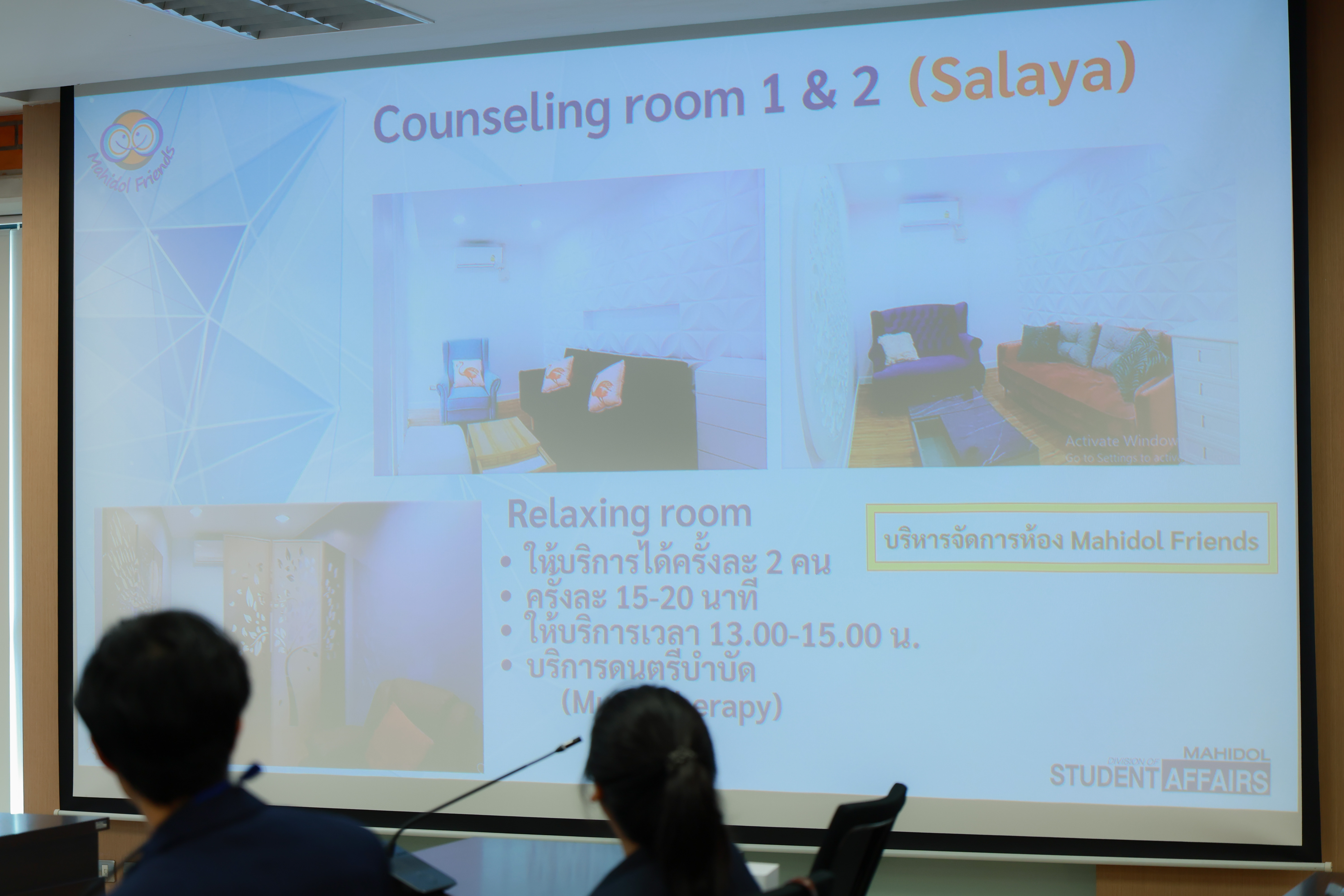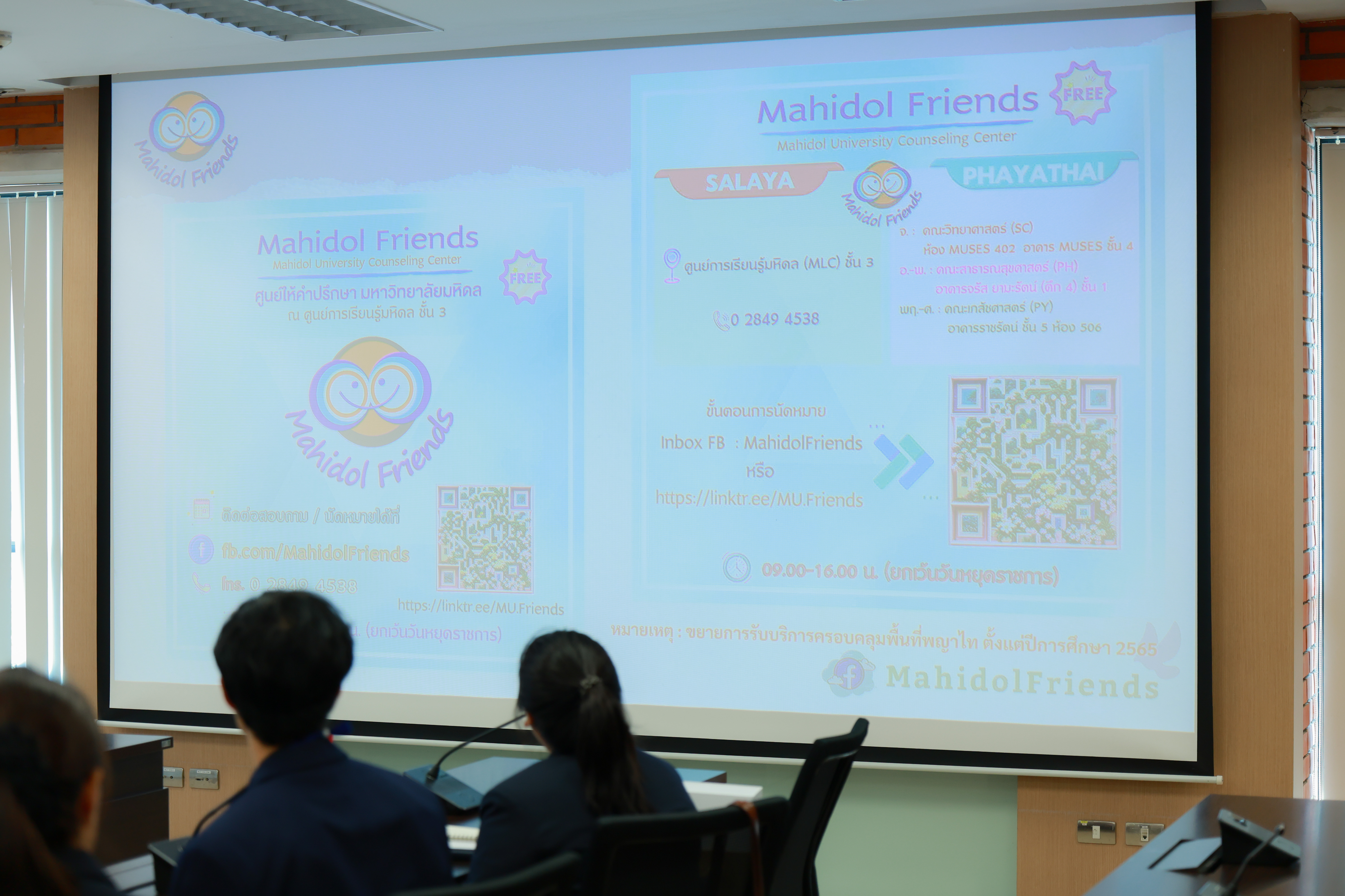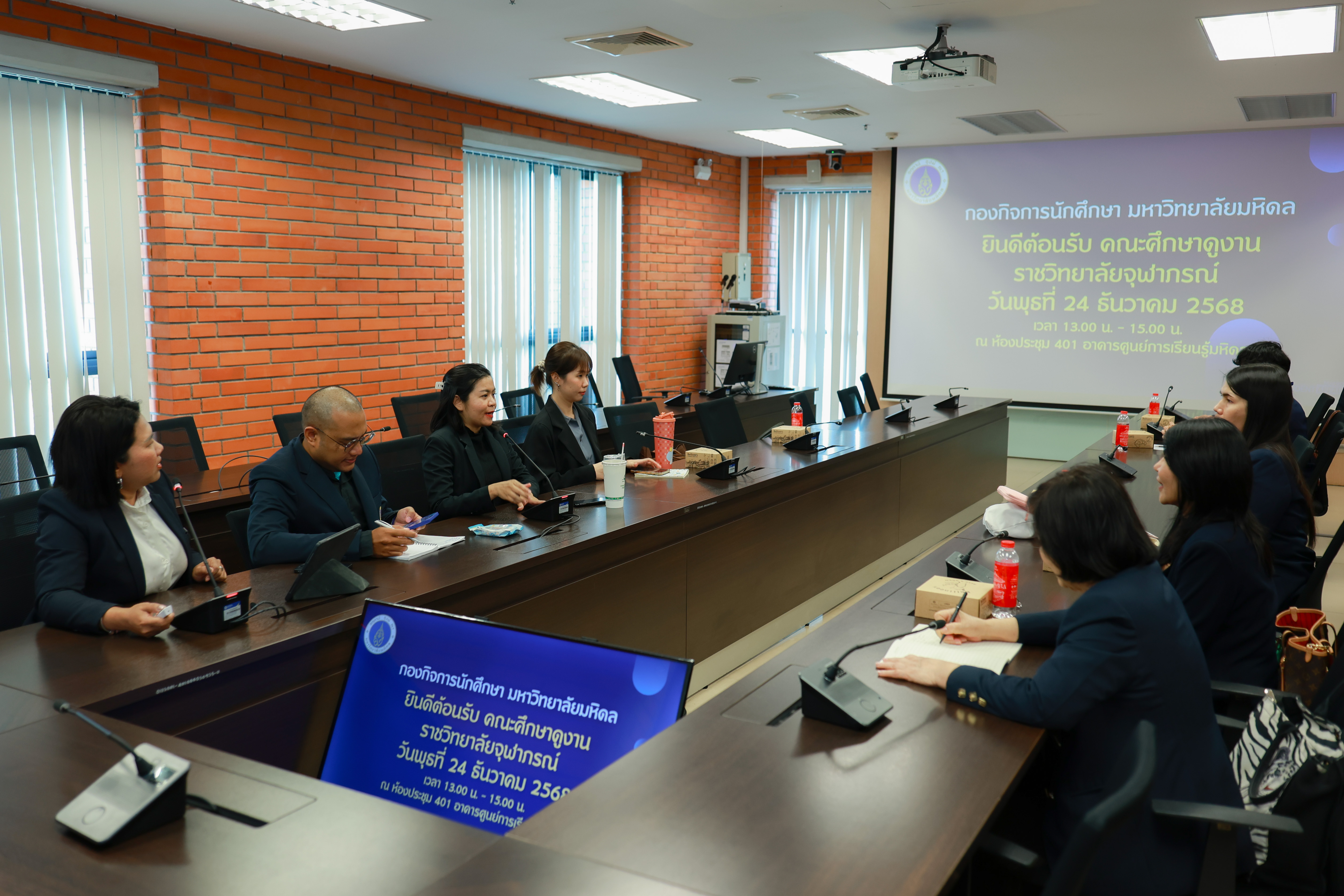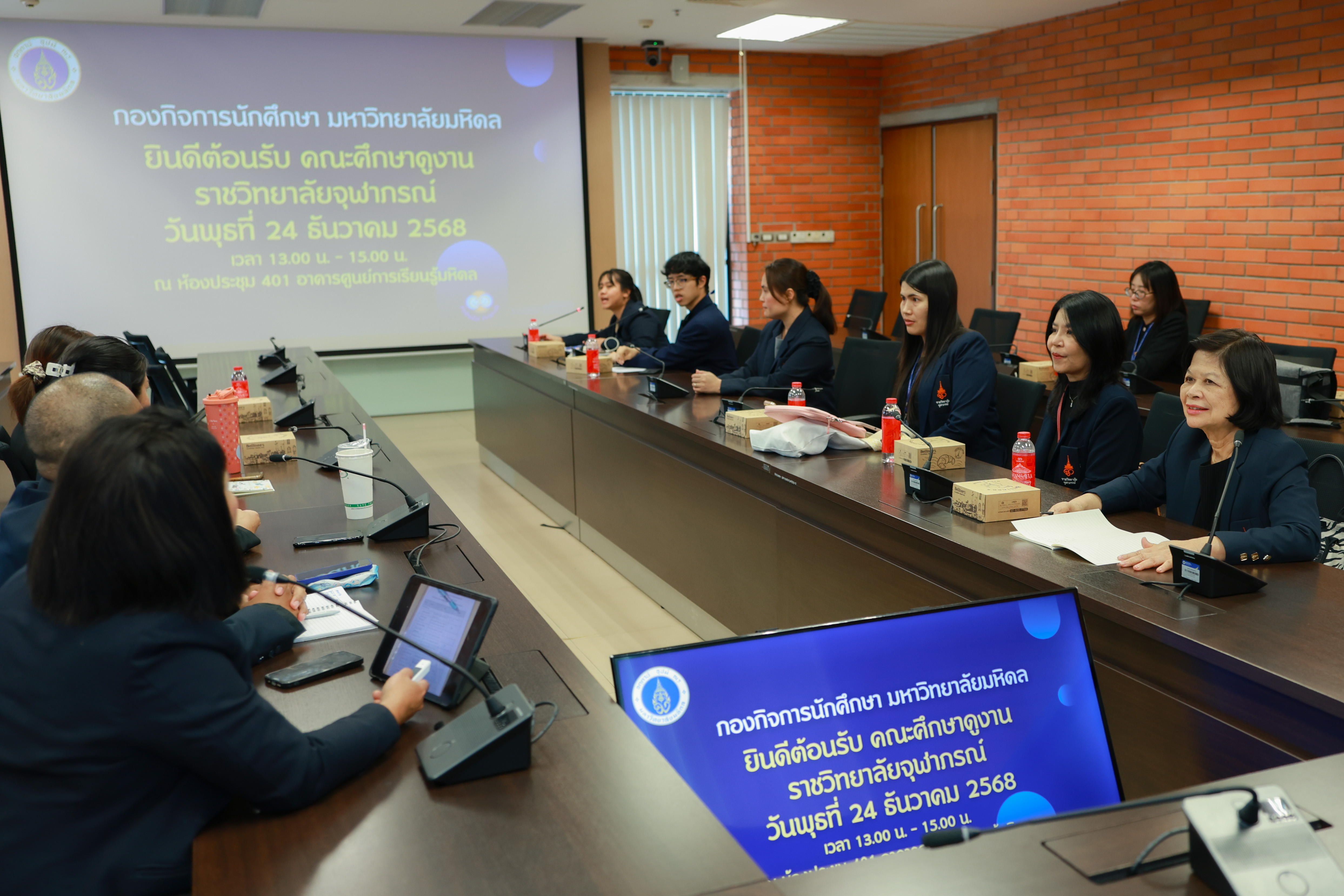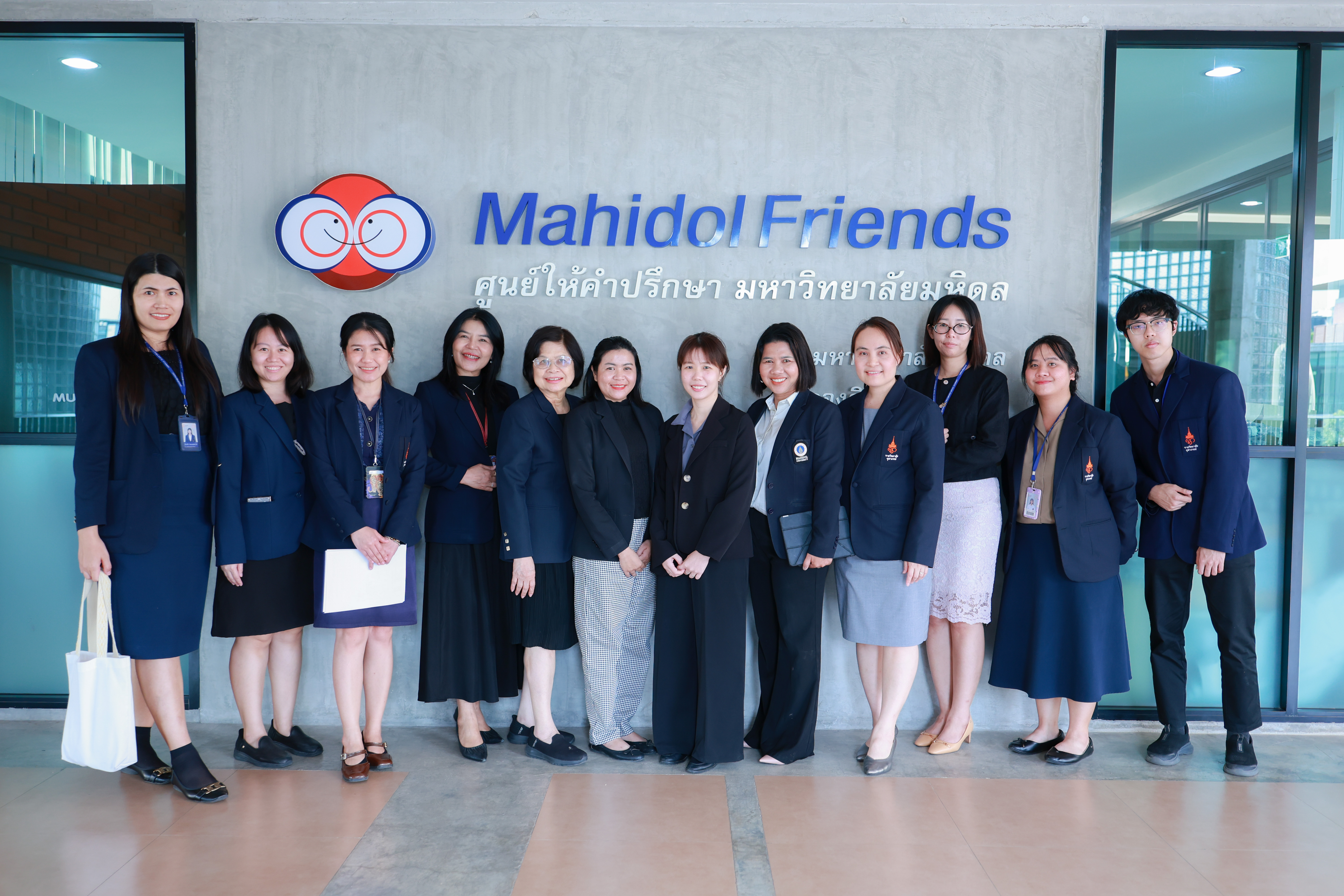 ศูนย์บริการให้คำปรึกษาทางสุขภาพจิต นำโดย ผู้ช่วยศาสตราจารย์ ดร.ประภา ยุทธไตร รองคณบดีฝ่ายบริการวิชาการและหลักสูตรการพยาบาลเฉพาะทาง อาจารย์ ดร.ดวงแก้ว เตชะกาญจนเวช ผู้อำนวยการศูนย์บริการให้คำปรึกษาทางสุขภาพจิต พร้อมด้วยคณาจารย์จากภาควิชาสุขภาพจิตและการพยาบาลจิตเวช และนักจิตวิทยาประจำศูนย์บริการให้คำปรึกษาทางสุขภาพจิต คณะพยาบาลศาสตร์อัครราชกุมารี ราชวิทยาลัยจุฬาภรณ์ ร่วมศึกษาดูงานและเยี่ยมชมศูนย์ให้คำปรึกษาสุขภาพใจ (MU Friends) มหาวิทยาลัยมหิดล โดยมี รองศาสตราจารย์ เรืออากาศโท ทันตแพทย์ชัชชัย คุณาวิศรุต รองอธิการบดีฝ่ายกิจการนักศึกษาและศิษย์เก่าสัมพันธ์ พร้อมด้วยนางสาวกนกรัตน์ นพโสภณ นักวิชาการศึกษา (ผู้ชำนาญการพิเศษ) หัวหน้างานบริการและสวัสดิการนักศึกษา กองกิจการนักศึกษา และนักจิตวิทยาจากกองกิจการนักศึกษา มหาวิทยาลัยมหิดล ให้การต้อนรับ เมื่อวันที่ 24 ธันวาคม 2568 ณ ศูนย์ให้คำปรึกษาสุขภาพใจ (MU Friends) ชั้น 3 กองกิจการนักศึกษา มหาวิทยาลัยมหิดล ศาลายา จังหวัดนครปฐม