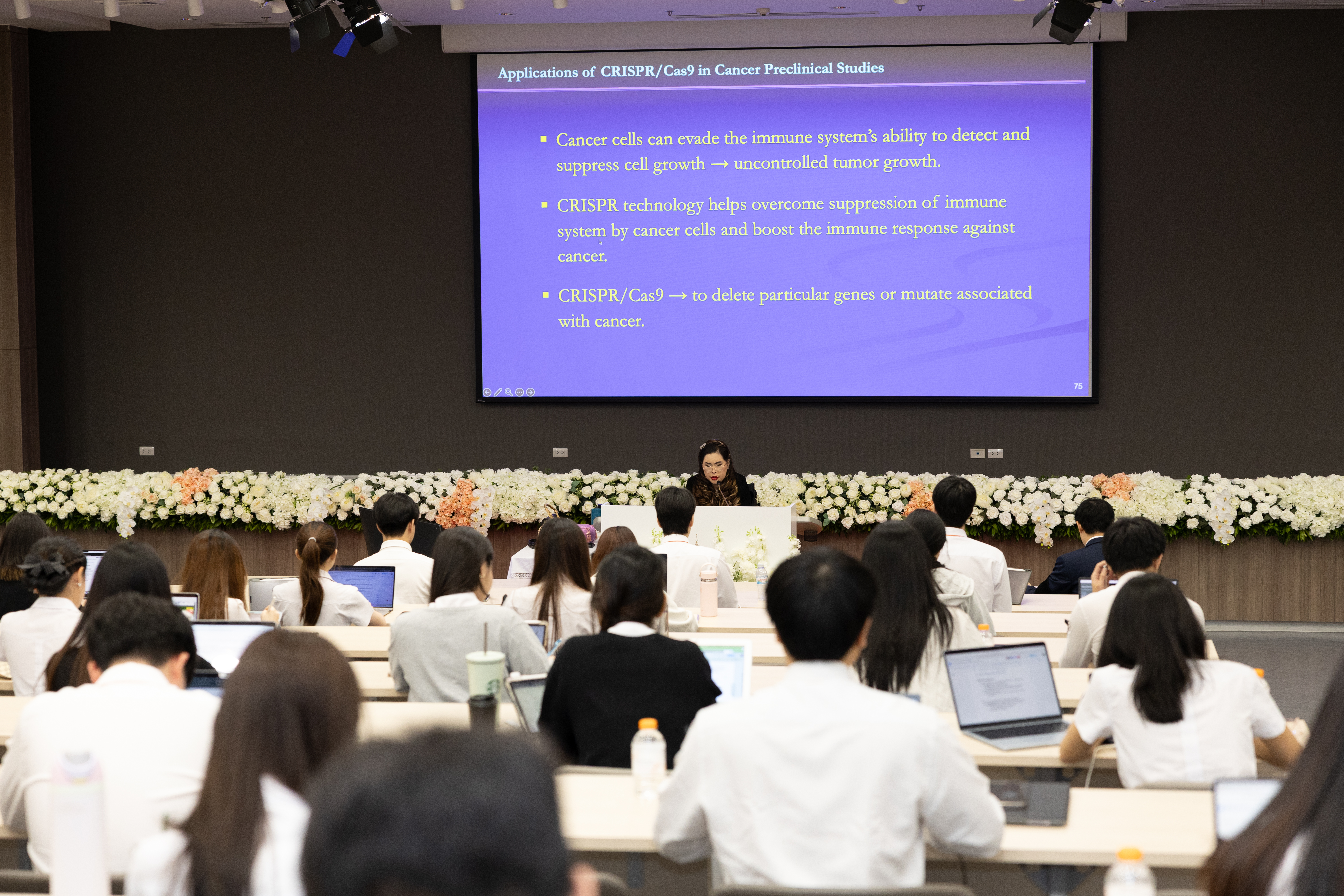 สำหรับครั้งนี้ ทรงบรรยายถึงการใช้เทคโนโลยี CRISPR/Cas9(คริสเปอร์-แคสไนน์) ซึ่งเป็นเทคโนโลยีตัดต่อยีนในการรักษาโรคมะเร็ง ซึ่งเป็นความหวังใหม่ในการรักษาผู้ป่วยมะเร็งที่มีประสิทธิภาพและมีผลข้างเคียงต่ำ ทั้งนี้จากการวิจัย พบว่าการยับยั้งยีน หลายประเภท เช่น CD133 miR3064 สามารถทำให้เซลล์มะเร็งลดการเจริญเติบโตและลดการแพร่กระจายได้จริง รวมทั้งอาจเพิ่ม อัตราการตอบสนองต่อการรักษาด้วยยาเคมีบำบัดด้วย ทั้งนี้ได้มีการนำเทคโนโลยีนี้มาใช้ในการรักษาโรคเลือดบางชนิดที่เป็นความผิดปกติทางพันธุกรรม โดยได้รับรับรองจากองค์การอาหารและยาในยุโรปและอเมริกา นอกจากนี้อาจนำไปใช้ในการตัดแต่งพันธุกรรมของ T-cell ที่เรียกว่า CAR-T cell therapy เพื่อรักษามะเร็งเม็ดเลือดขาวบางชนิดได้ด้วย ในส่วนกลไกการกระตุ้นภูมิคุ้มกันโดยการตัดต่อพันธุกรรมของ T-cells เพื่อรักษามะเร็งชนิดอื่นๆ เช่นมะเร็งปอดหรือมะเร็งกระดูก ยังอยู่ในกระบวนการวิจัยทางคลินิกเช่นกัน แต่ถึงกระนั้นก็ยังมีความท้าทายอีกหลายประการ ซึ่งความรู้ระดับยีนและ ชีวโมเลกุลของโรคมะเร็ง จะช่วยทำให้ เกิดความเข้าใจ กลไกการเกิดโรคและการรักษาโรคที่ถูกต้อง นำไปสู่การรักษามะเร็งอย่างมีเป้าหมายและเป็นการรักษาเฉพาะบุคคลได้ต่อไปในอนาคต