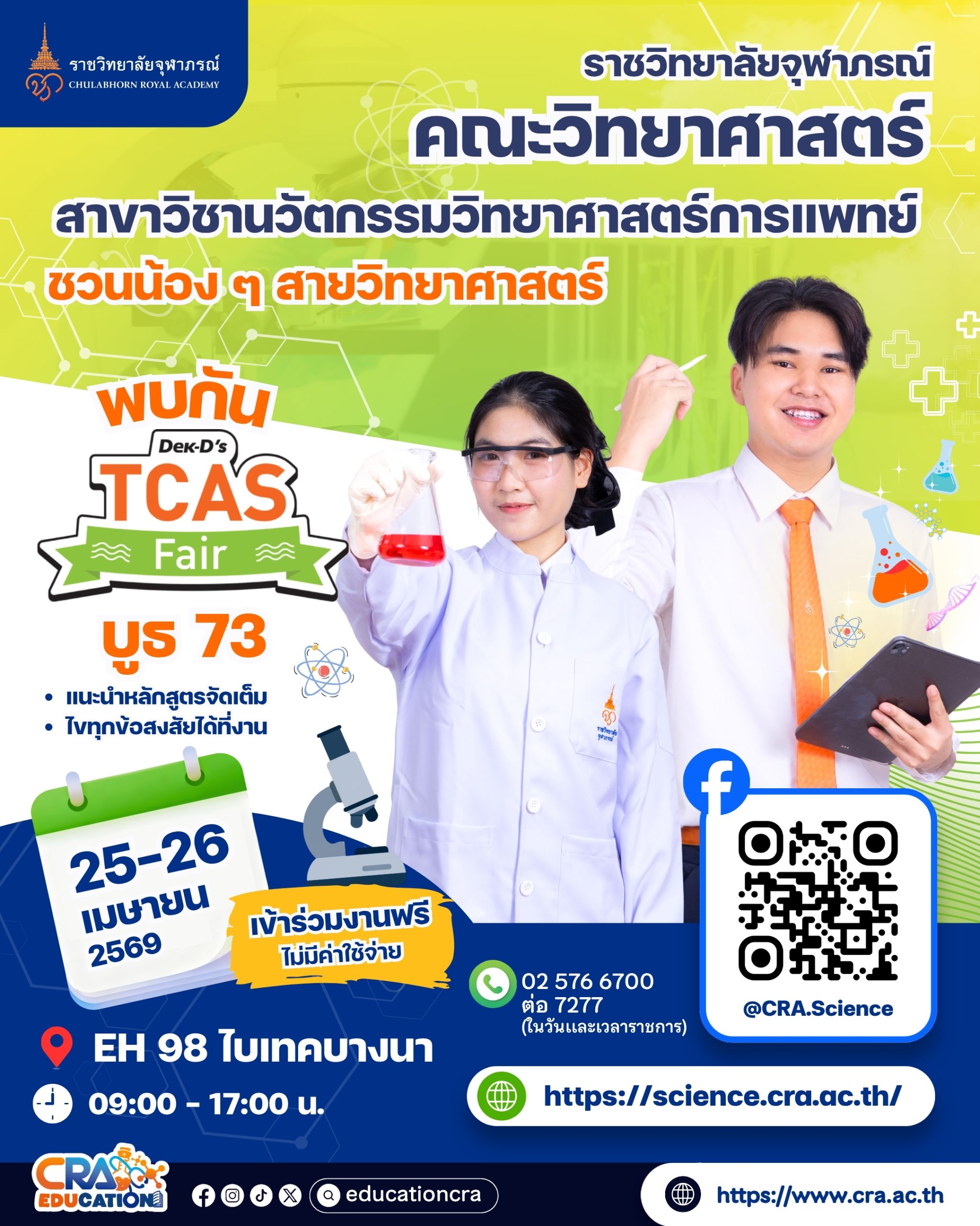 ได้ที่งาน Dek-D’s TCAS Fair 2026 🎉 บูธ 73 – 76, 107 – 110 ราชวิทยาลัยจุฬาภรณ์