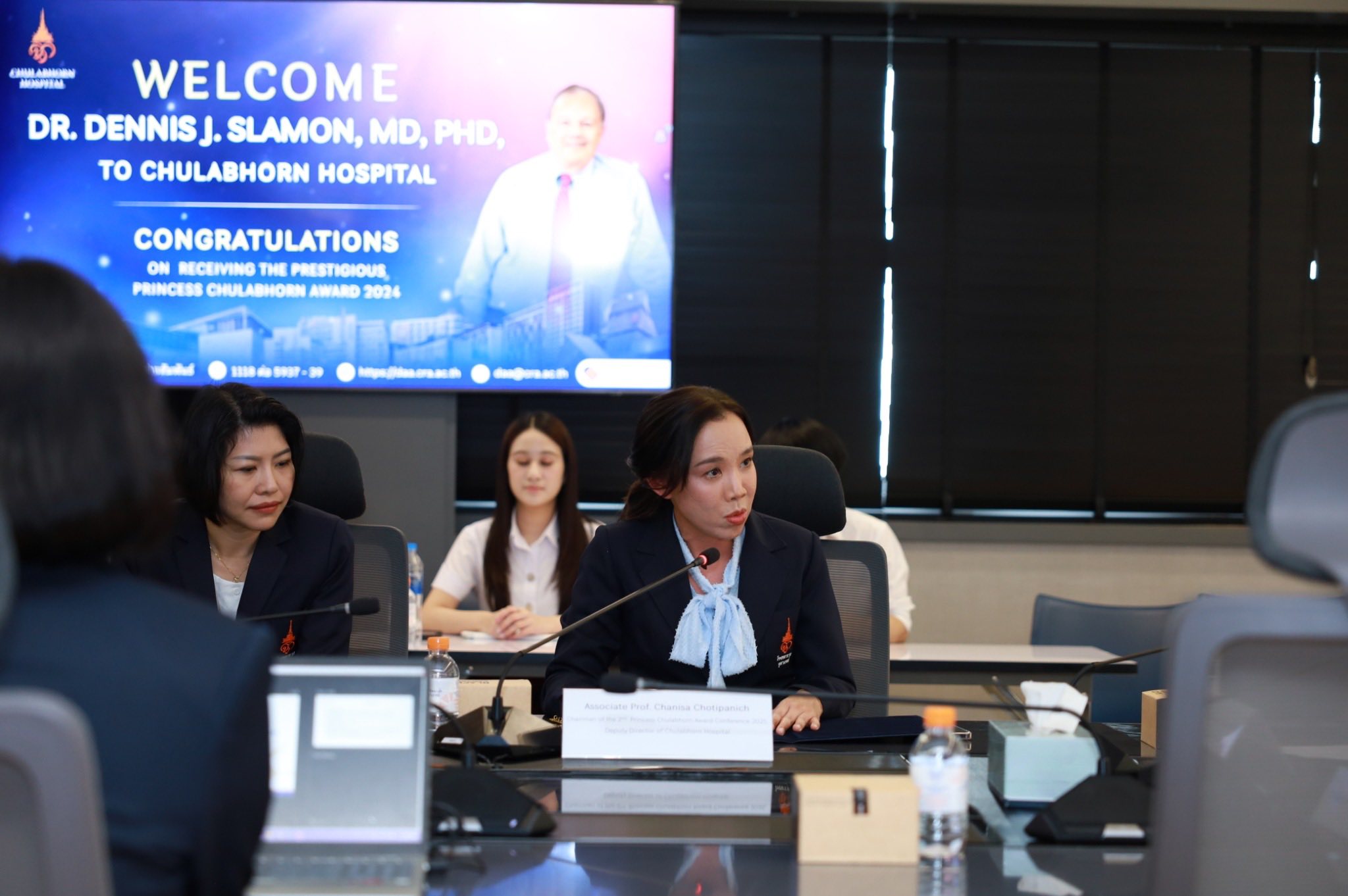 ๑๘ กรกฎาคม ๒๕๖๘ รองศาสตราจารย์ นายแพทย์สุรศักดิ์ ลีลาอุดมลิปิ รักษาการผู้อำนวยการโรงพยาบาลจุฬาภรณ์ , รองศาสตราจารย์ แพทย์หญิงชนิสา โชติพานิช รองผู้อำนวยการโรงพยาบาลจุฬาภรณ์ และประธานกรรมการจัดงานประชุมวิชาการรางวัลสมเด็จเจ้าฟ้าจุฬาภรณ์ ครั้งที่ 2 , แพทย์หญิงจอมธนา ศิริไพบูลย์ ผู้อำนวยการศูนย์มะเร็งวิทยา โรงพยาบาลจุฬาภรณ์ , ผู้ช่วยศาสตราจารย์ปฏิบัติการ แพทย์หญิงอัจฉรา สุภาวเวช หัวหน้างานอายุรกรรมมะเร็งวิทยา , แพทย์หญิงกัญญานีย์ แลบัว หัวหน้างานรังสีรักษามะเร็งวิทยา , แพทย์หญิงเอมวิภา ลือประสิทธิ์สกุล หัวหน้างานอายุรกรรมโลหิตวิทยา และ นางรัตนา จุลสวัสดิ์ หัวหน้าฝ่ายการพยาบาล ร่วมให้การต้อนรับศาสตราจารย์ ดร. นายแพทย์เดนนิส เจ. สเลมอน ผู้ได้รับพระราชทานรางวัลสมเด็จเจ้าฟ้าจุฬาภรณ์ ประจำปี ๒๕๖๗ ณ ชั้น ๑ อาคารอัครราชกุมารี โรงพยาบาลจุฬาภรณ์ โดยคณะผู้บริหารได้ร่วมถ่ายภาพเป็นที่ระลึกหน้าพระรูป ศาสตราจารย์ ดร. สมเด็จพระเจ้าน้องนางเธอ เจ้าฟ้าจุฬาภรณวลัยลักษณ์ อัครราชกุมารี กรมพระศรีสวางควัฒน วรขัตติยราชนารี ก่อนนำศาสตราจารย์ ดร. นายแพทย์เดนนิส เจ. สเลมอน ไปยังห้องประชุม ชั้น ๙ อาคารอัครราชกุมารี