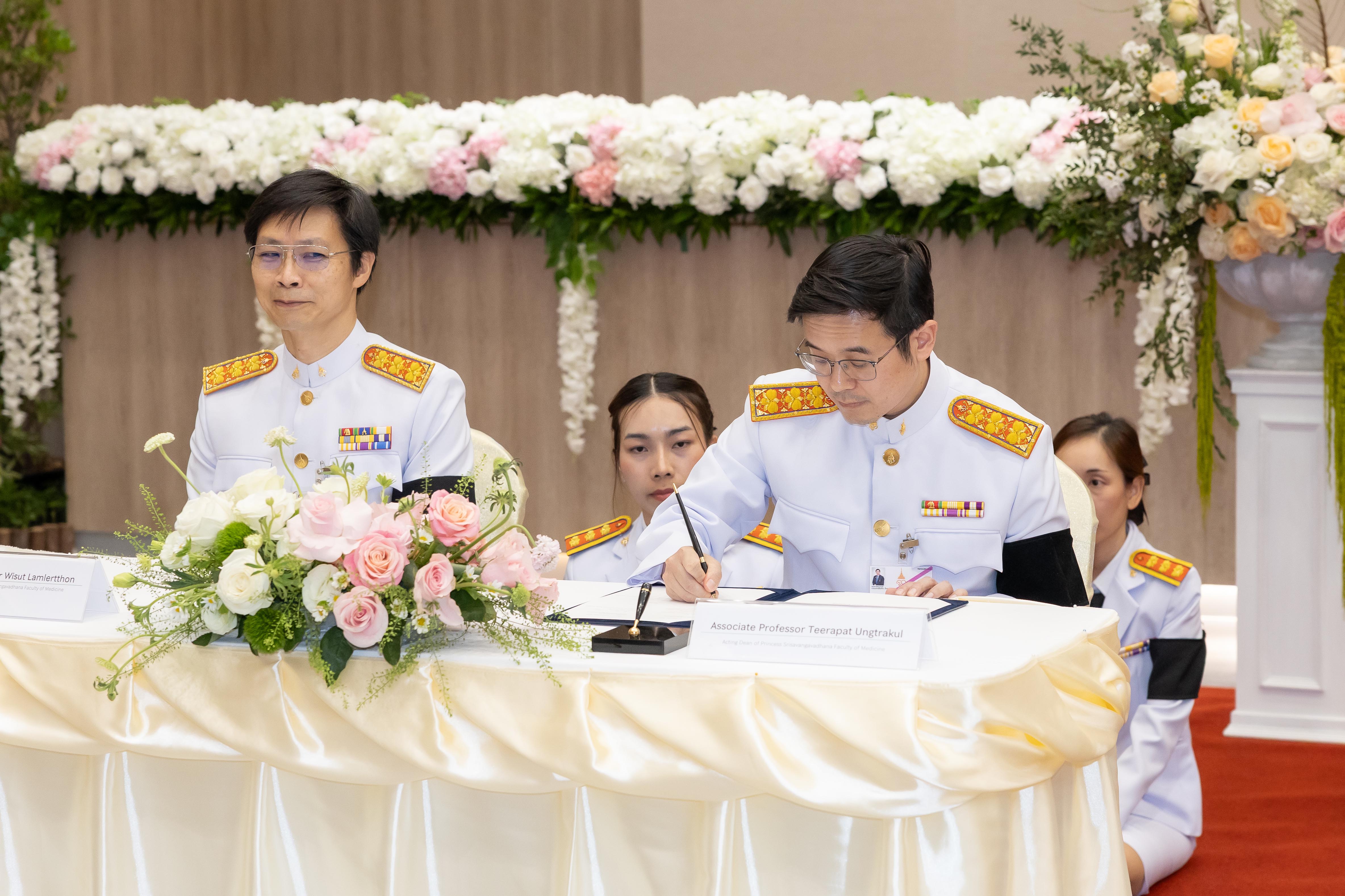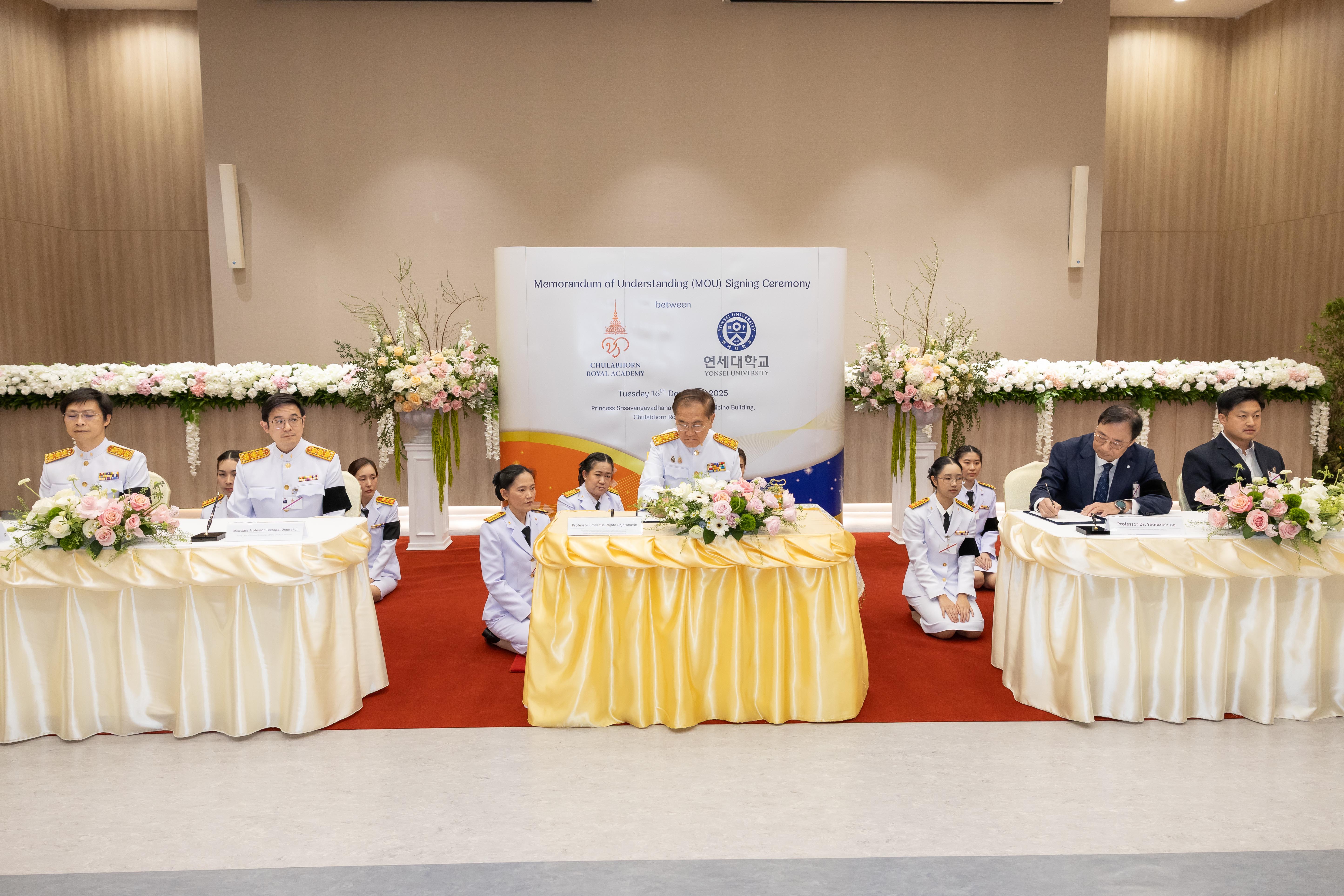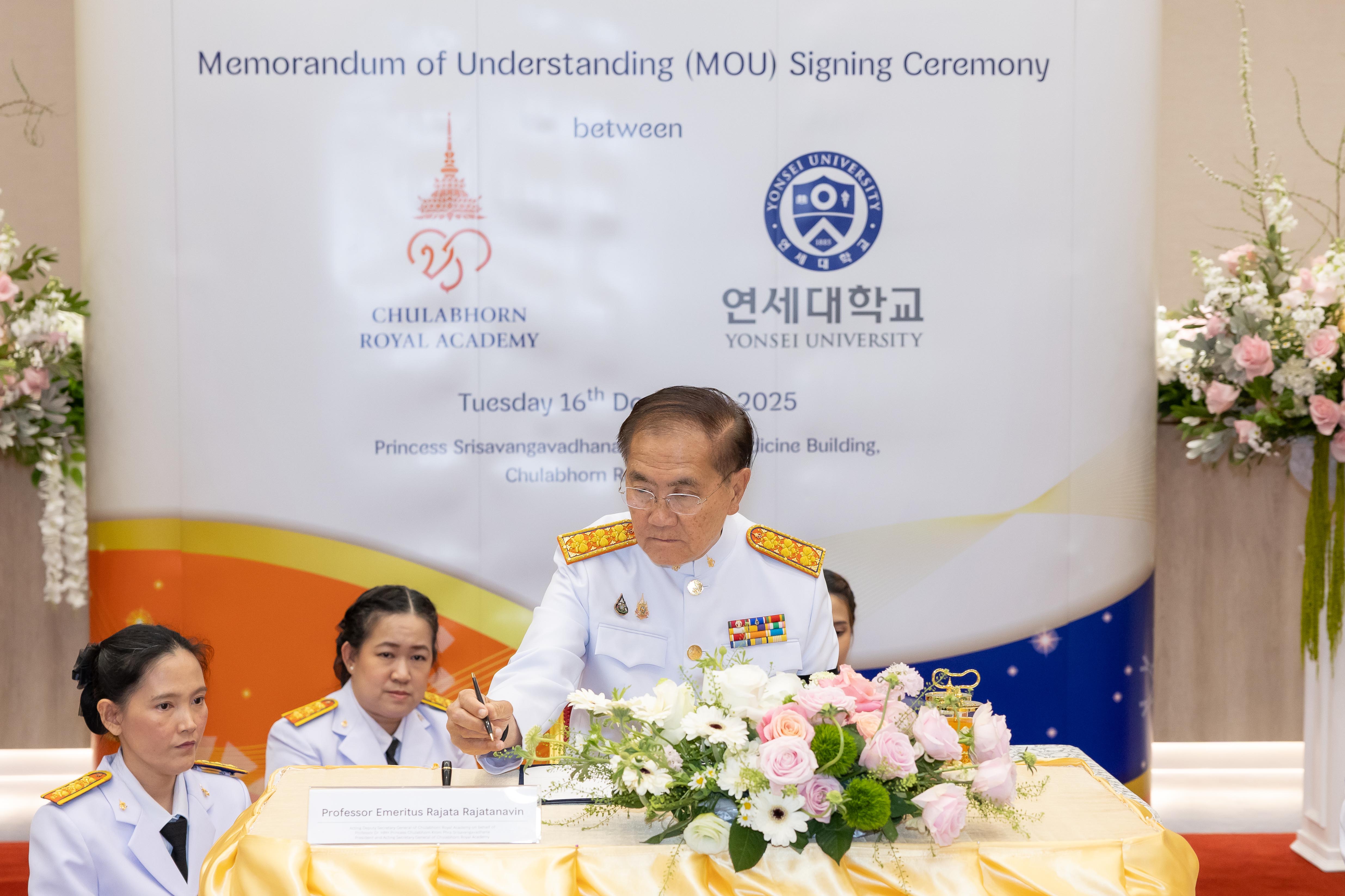 วันอังคารที่ ๑๖ ธันวาคม ๒๕๖๘ ศาสตราจารย์ ดร. สมเด็จพระเจ้าน้องนางเธอ เจ้าฟ้าจุฬาภรณวลัยลักษณ์ อัครราชกุมารี กรมพระศรีสวางควัฒน วรขัตติยราชนารี องค์ประธานและนายกสภาราชวิทยาลัยจุฬาภรณ์ ทรงพระกรุณาโปรดให้ ศาสตราจารย์เกียรติคุณ นายแพทย์รัชตะ รัชตะนาวิน รักษาการรองเลขาธิการราชวิทยาลัยจุฬาภรณ์เป็นผู้แทนพระองค์ ในพิธีลงนามบันทึกข้อตกลงความร่วมมือระหว่างราชวิทยาลัยจุฬาภรณ์ กับ มหาวิทยาลัยยอนเซ วิทยาเขตมิเร (Yonsei University Mirae Campus) สาธารณรัฐเกาหลี ณ ห้องประชุม 3D – 301 อาคารวิทยาลัยแพทยศาสตร์ศรีสวางควัฒน ราชวิทยาลัยจุฬาภรณ์ เขตหลักสี่ กรุงเทพมหานคร โดยมี ศาสตราจารย์ แพทย์หญิงยุวเรศมคฐ์ สิทธิชาญบัญชา รักษาการรองเลขาธิการราชวิทยาลัยจุฬาภรณ์ รองศาสตราจารย์ นายแพทย์ธีรภัทร อึ้งตระกูล รักษาการคณบดีคณะแพทยศาสตร์ศรีสวางควัฒน ผู้ช่วยศาสตราจารย์ นายแพทย์วิสุทธิ์ ล้ำเลิศธน รองคณบดีคณะแพทยศาสตร์ศรีสวางควัฒน และผู้ช่วยศาสตราจารย์ ดร.เธียรสิน เลี่ยมสุวรรณ ผู้ช่วยคณบดีคณะแพทยศาสตร์ศรีสวางควัฒน ฝ่ายบัณฑิตศึกษาและการศึกษาต่อเนื่อง รอรับผู้แทนพระองค์
