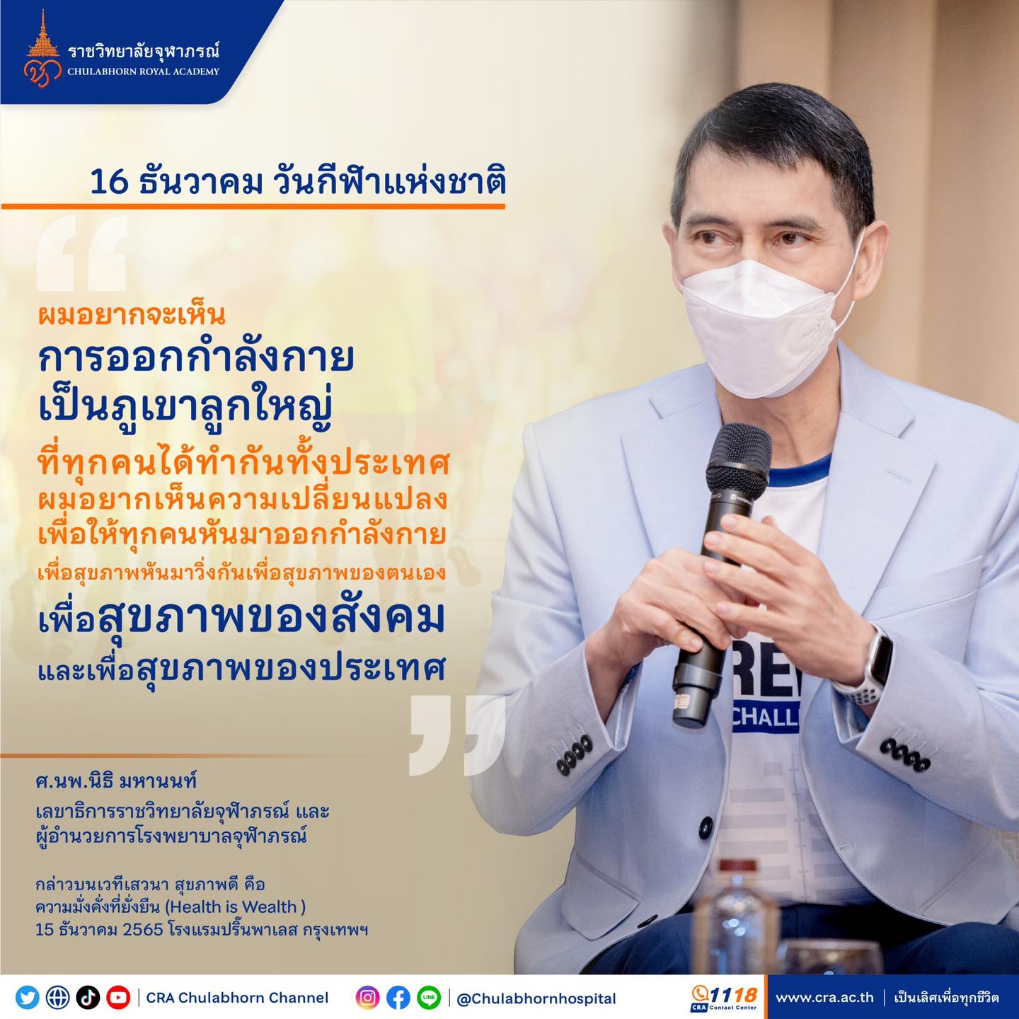 ศาสตราจารย์ นายแพทย์นิธิ มหานนท์ เลขาธิการราชวิทยาลัยจุฬาภรณ์ และผู้อำนวยการโรงพยาบาลจุฬาภรณ์ กล่าวบนเวทีเสวนา สุขภาพดี คือ ความมั่งคั่งที่ยั่งยืน (Health is Wealth ) เมื่อวันที่ 15 ธันวาคม 2565 โรงแรมปริ๊นพาเลส กรุงเทพฯ