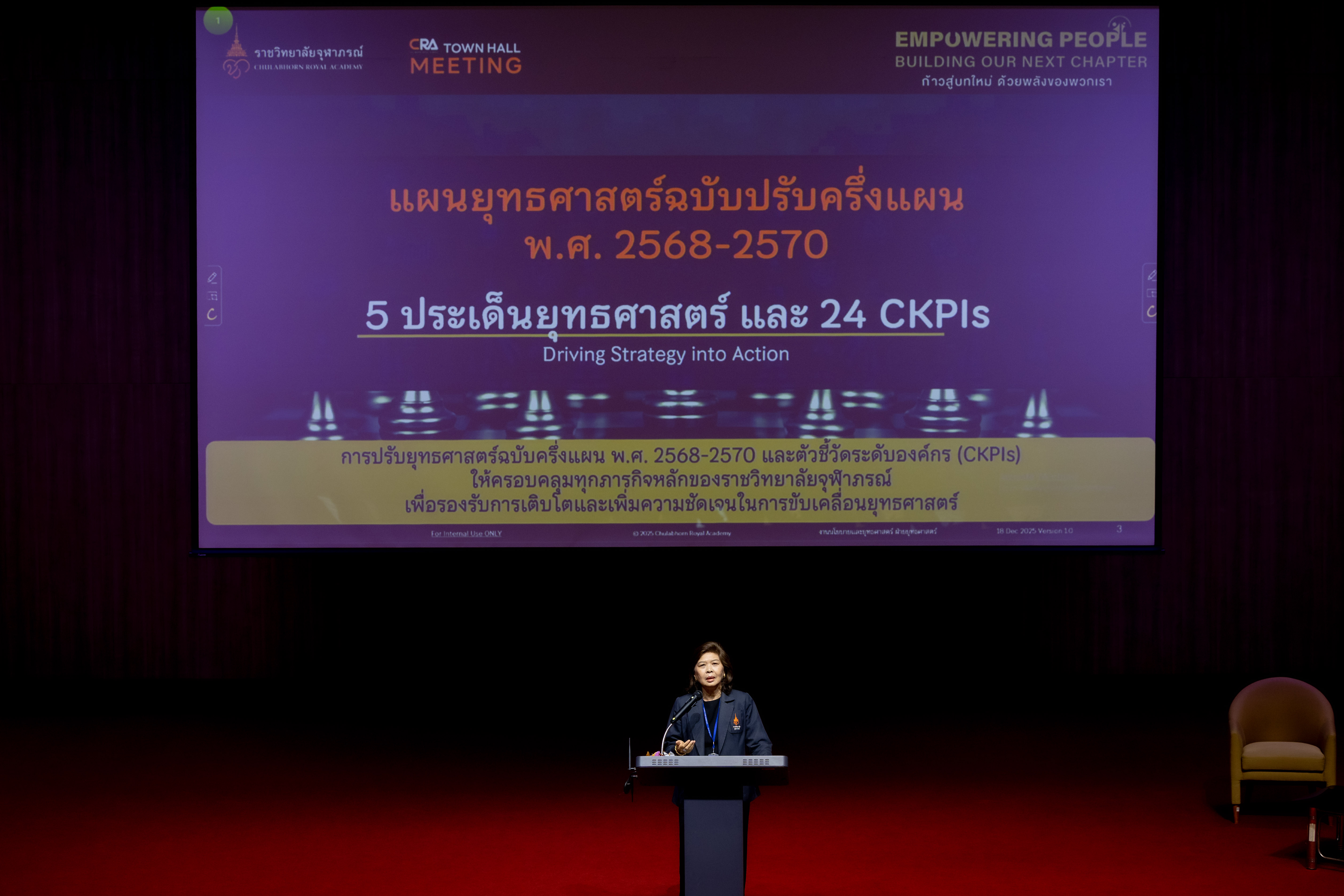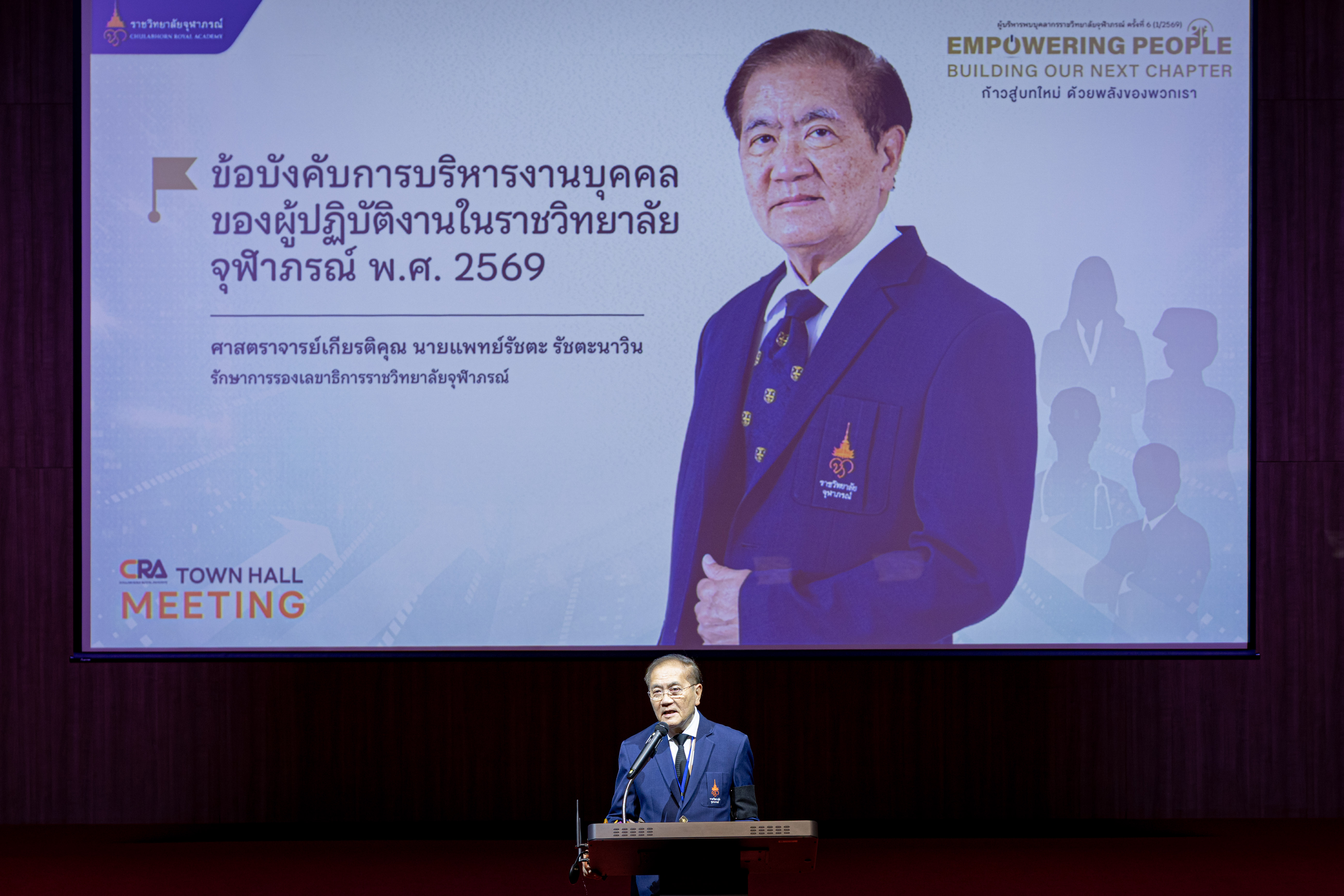 วันที่ ๑๘ ธันวาคม ๒๕๖๘ : ราชวิทยาลัยจุฬาภรณ์ จัดกิจกรรมผู้บริหารพบบุคลากร CRA Town Hall Meeting ครั้งที่ ๖ (๑/๒๕๖๙) ภายใต้แนวคิด “Empowering People : Building Our Next Chapter ก้าวสู่บทใหม่ ด้วยพลังของพวกเรา” เพื่อสื่อสารผลงานการขับเคลื่อนดำเนินงานจากทุกส่วนงานของราชวิทยาลัยจุฬาภรณ์ในไตรมาสแรกของปีงบประมาณ ๒๕๖๙ (ตุลาคม-ธันวาคม ๒๕๖๘) และเสริมสร้างพลังการทำงานเตรียมพร้อมสู่ปีพุทธศักราชใหม่ โดยมี ศาสตราจารย์เกียรติคุณ นายแพทย์รัชตะ รัชตะนาวิน รักษาการรองเลขาธิการราชวิทยาลัยจุฬาภรณ์ ขึ้นเวทีสื่อสารถึงการปรับปรุงข้อบังคับการบริหารงานบุคคลของผู้ปฏิบัติงานในราชวิทยาลัยจุฬาภรณ์ พร้อมด้วย รองศาสตราจารย์ ดร.เภสัชกรหญิงจุฑามณี สุทธิสีสังข์ รักษาการรองเลขาธิการราชวิทยาลัยจุฬาภรณ์ สื่อสารถึง Flagship เรือธงยุทธศาสตร์ของราชวิทยาลัยจุฬาภรณ์ พ.ศ. ๒๕๖๙